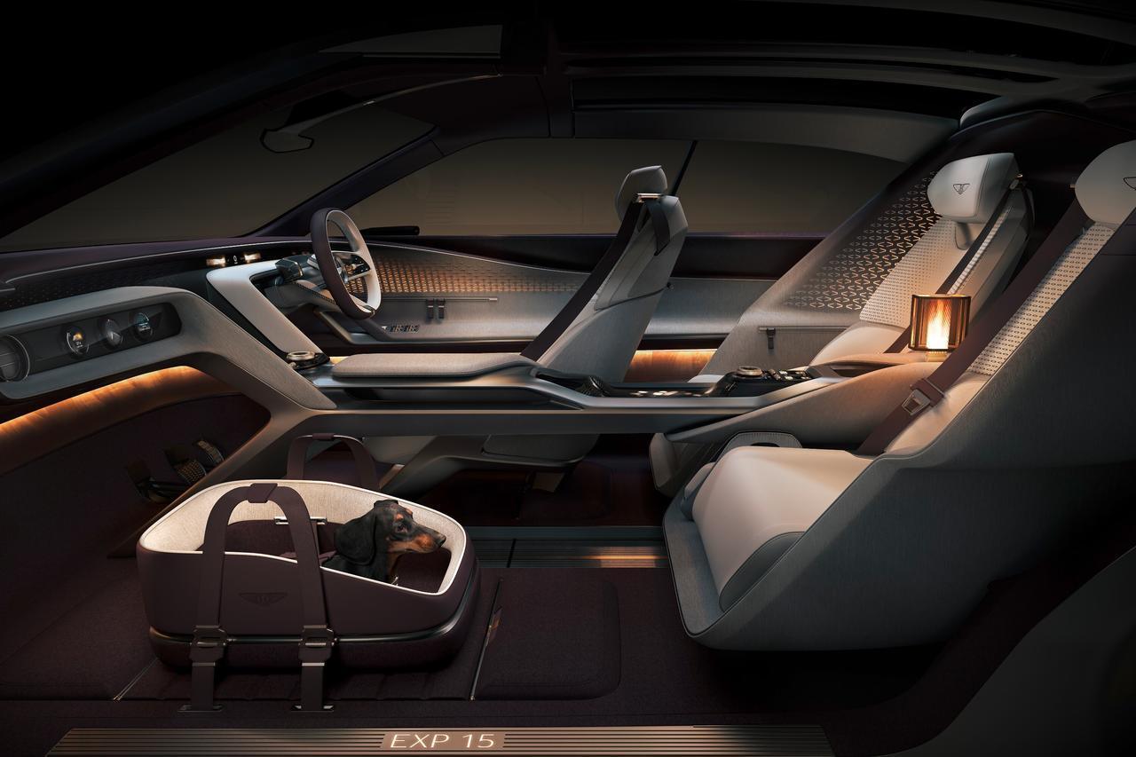 Bentley EXP 15 mizează pe un interior rafinat, dar durabil. În locul pielii naturale tradiționale, Bentley a optat pentru materiale precum lâna și mătasea, combinate în tonuri calde de maro, pentru a crea o atmosferă caldă și elegantă. Cabina este configurată pentru trei persoane: două fotolii în spate și doar scaunul șoferului în față, reflectând un nou mod de utilizare a spațiului și o reconfigurare a ideii de confort în automobilul electric de lux.