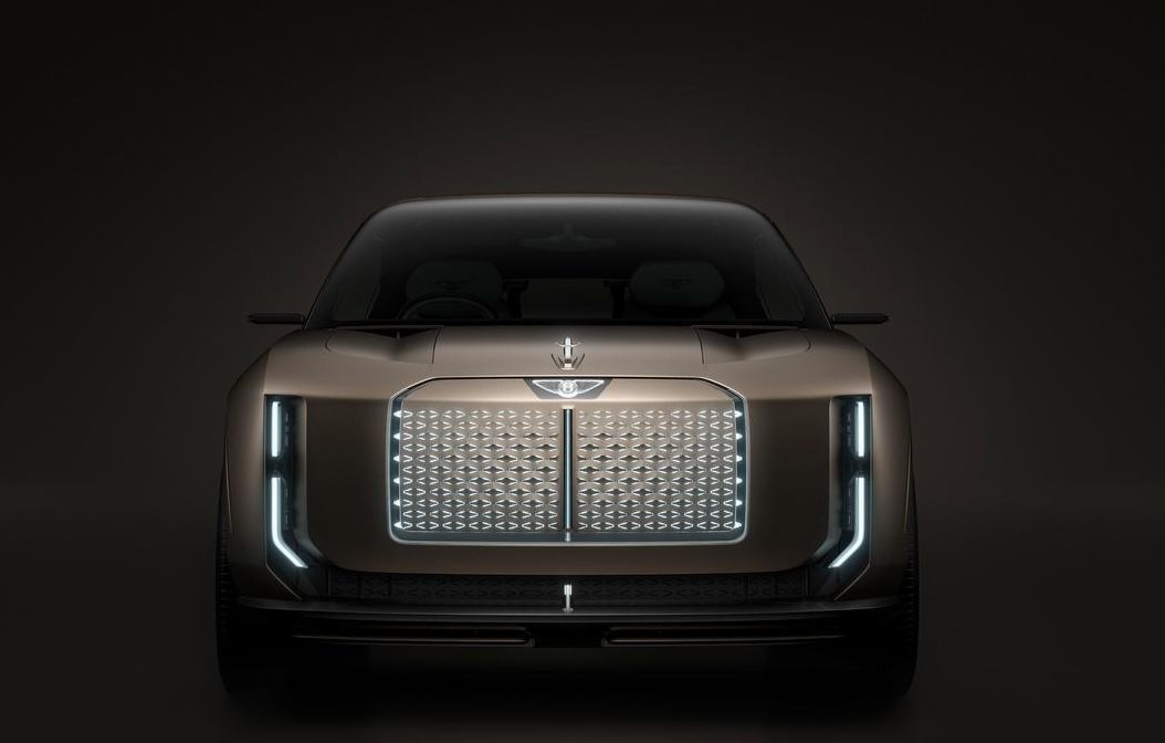 În absența unui motor termic, Bentley a trebuit să regândească fața mașinii, păstrând totodată identitatea vizuală a brandului. Soluția găsită este un panou frontal iluminat cu LED-uri care imită aspectul unei grile clasice. Acesta integrează două semnături luminoase verticale în zona farurilor, fiecare compusă din două segmente distincte. Partea inferioară a fiecărui segment este curbată spre interior, contribuind la o expresivitate vizuală accentuată și la o recunoaștere imediată pe șosea.