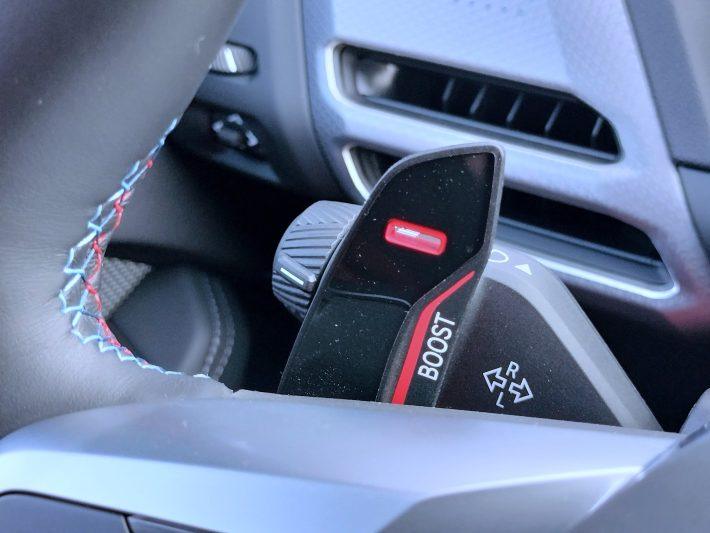Cea de pe partea stângă prezintă un interes special. Acţionată cel puţin o secundă, activează funcţia M Sport Boost care setează automat toate sistemele maşinii pe sportivitate maximă. Dacă vrei să decolezi de pe loc de parcă pleci de pe grila de start în campionatul de rally, funcția M Launch Control este exact ceea ce ai nevoie. Nu degeaba, la ora 12, volanul are un marcaj roşu.