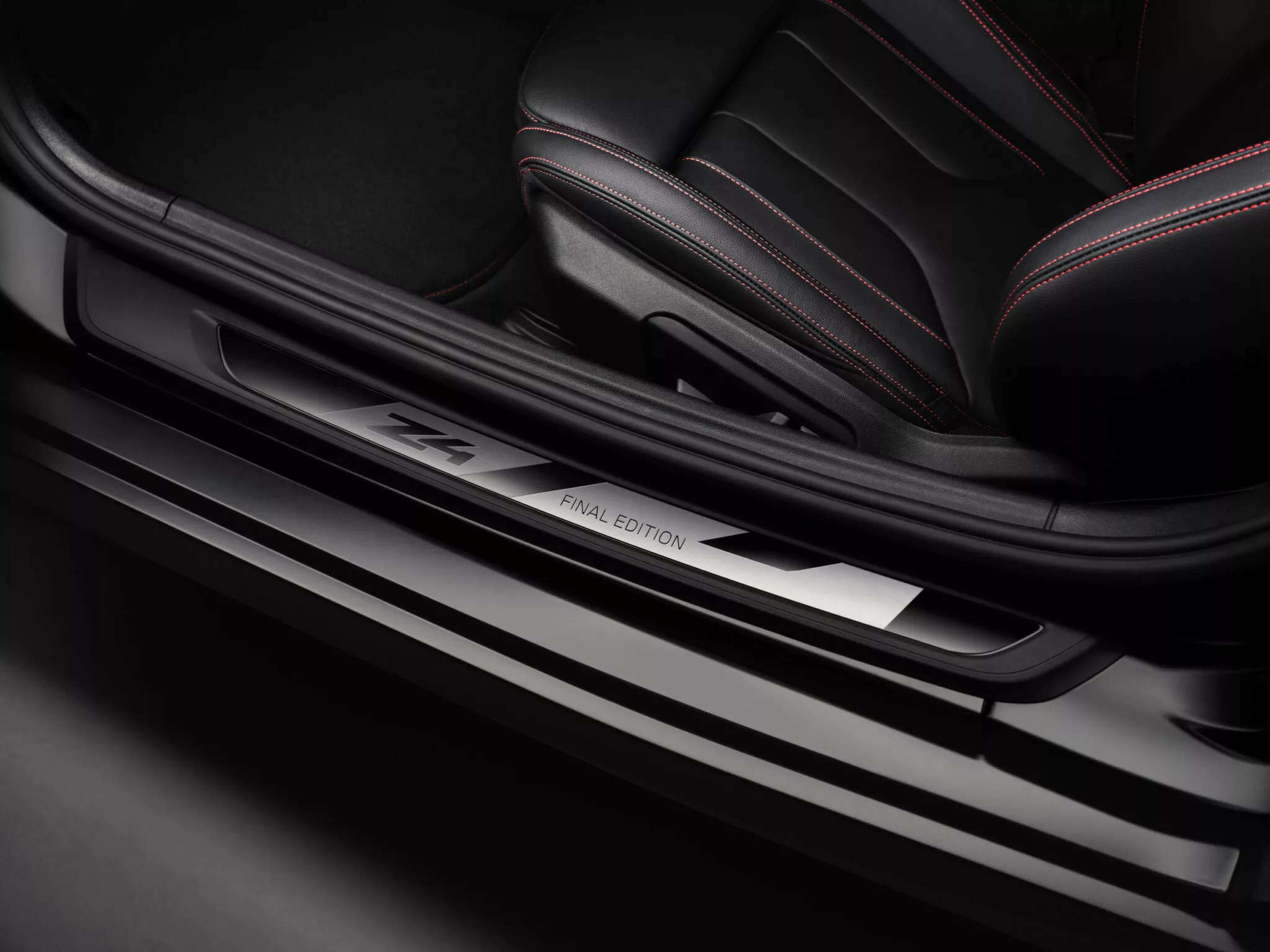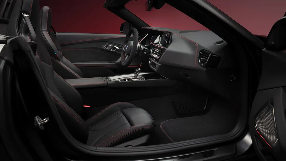 La interior, BMW Z4 Final Edition continuă tema contrastului: scaunele și panourile sunt tapisate cu piele Vernasca și Alcantara, finisate în negru. Contrastul e realizat prin cusături roșii, care traversează scaunele, volanul, planșa de bord, consola centrală și ușile, iar centurile de siguranță primesc nuanța distinctivă „M Tricolor”. Plăcuțele inscripționate „Final Edition” de pe praguri sunt singurele indicații subtile ale exclusivității modelului.