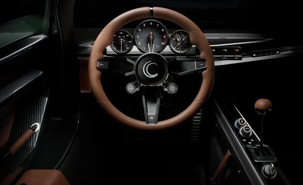 Cabina este o declaraţie a reducerii la esenţial: doar trei instrumente analogice (cu turometru central), comutatoare din titan şi aluminiu, tapiserie din piele Connolly sau Alcantara şi schimbător de viteze reglabil longitudinal cu 80 mm, pentru poziţia optimă a şoferului. Sistemul de direcţie cu servodirecţie electrică ce se dezactivează la viteză mare, suspensia push-rod (cu două braţe duble) cu moduri de rulare Comfort/Sport/Track şi garda la sol reglabilă prin sistemul de ridicare faţă/spate sunt detalii rar întâlnite într-o maşină de serie