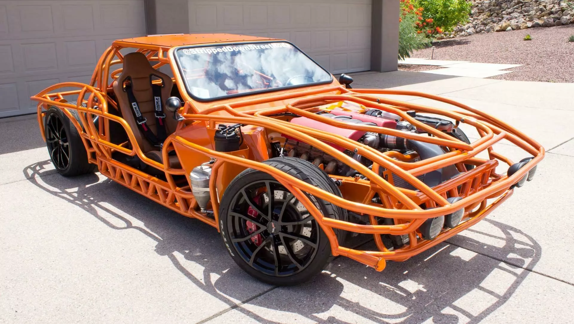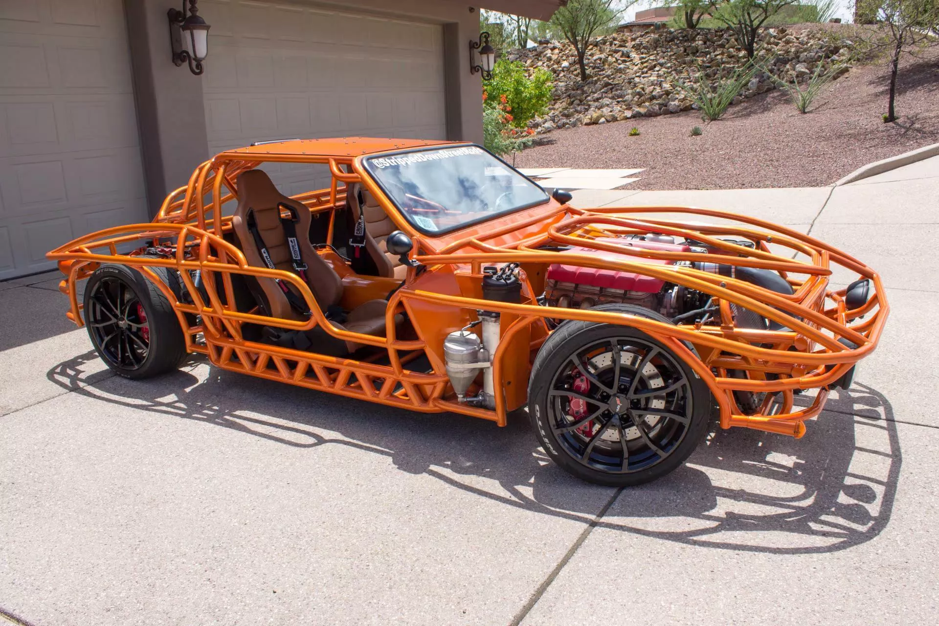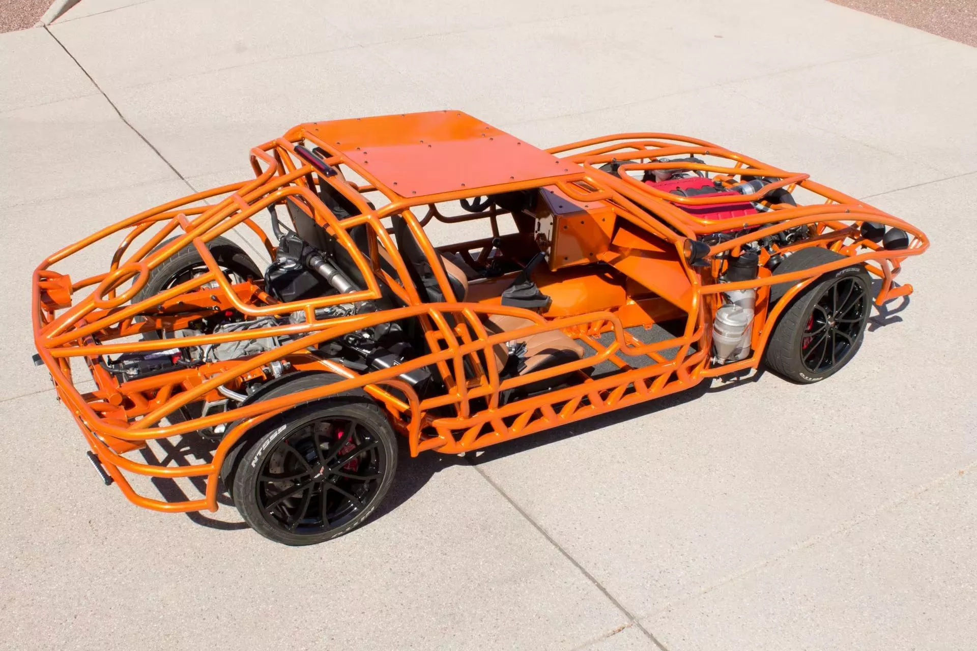 Elementul care atrage privirile este cadrul tubular exterior, vopsit într-o nuanţă aprinsă de portocaliu, care, la partea din spate, sugerează forma „split-window” (lunetă din două segmente) caracteristică modelului Corvette C2 din 1963. Totuşi, distanța față de original este considerabilă: Corvette Z06 tubular nu este o reproducere fidelă, iar proporţiile sunt mult reinterpretate, după cum se poate observa ușor. Această abordare conferă maşinii un aer mai degrabă sculptural, de art-car performant, decât unul de restaurare clasică.