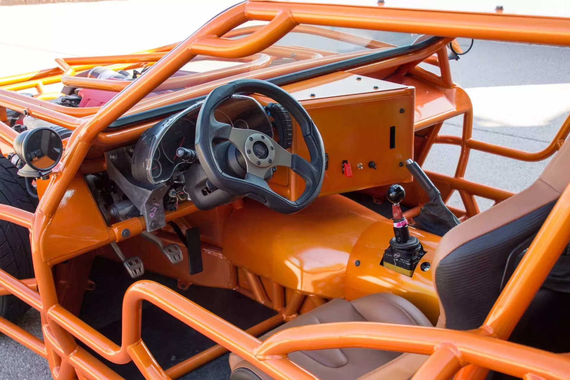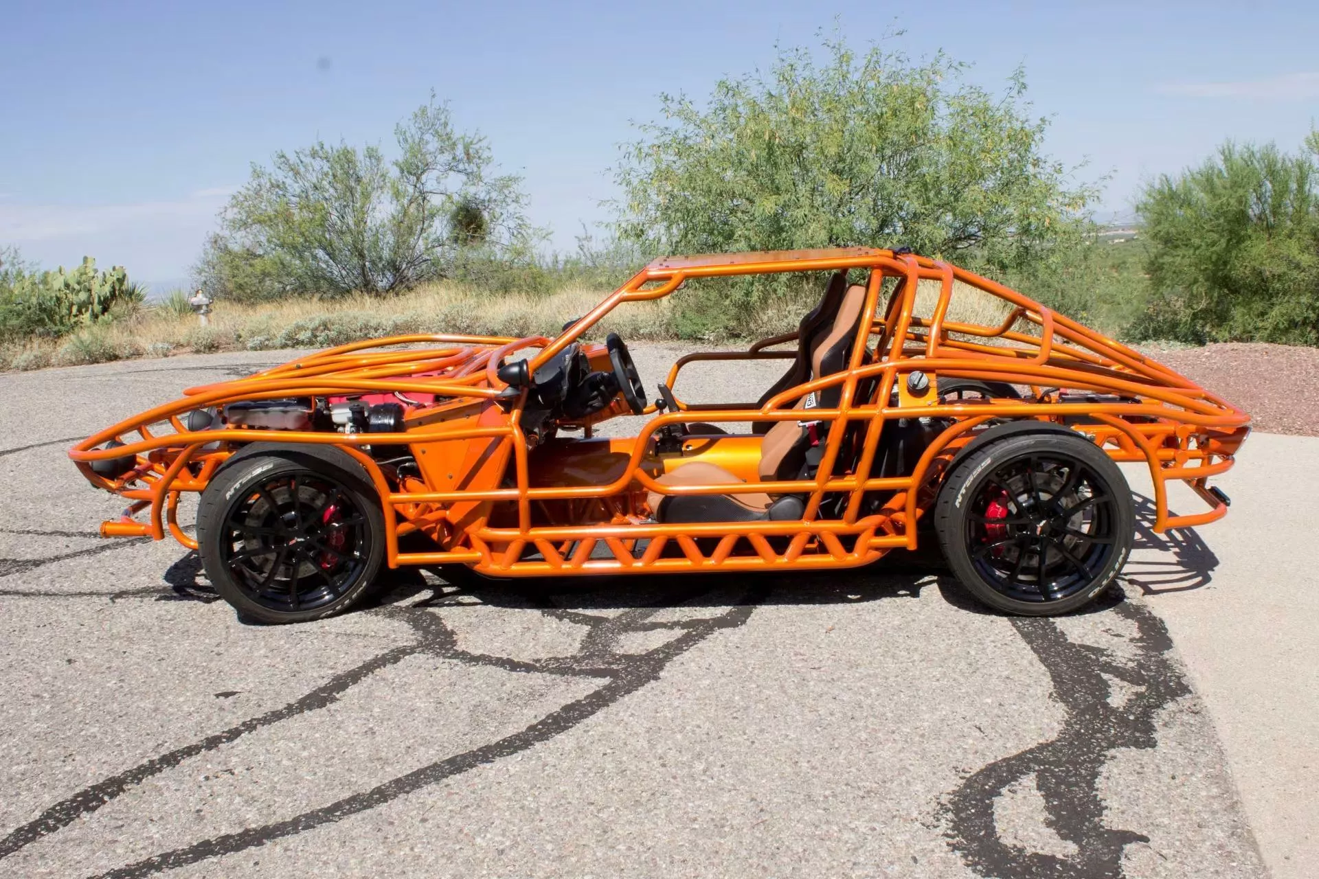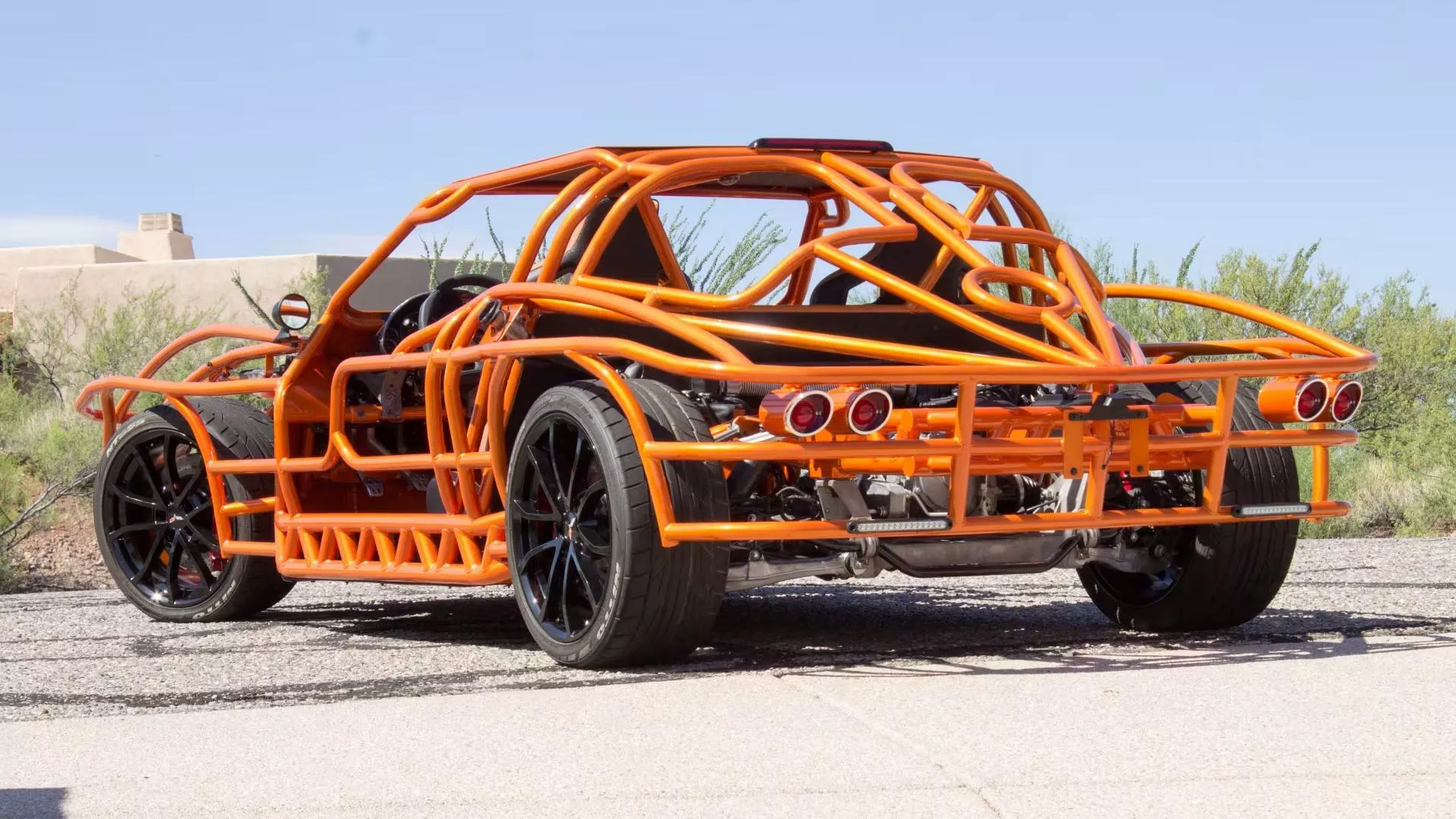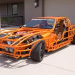 Elementul care atrage privirile este cadrul tubular exterior, vopsit într-o nuanţă aprinsă de portocaliu, care, la partea din spate, sugerează forma „split-window” (lunetă din două segmente) caracteristică modelului Corvette C2 din 1963. Totuşi, distanța față de original este considerabilă: Corvette Z06 tubular nu este o reproducere fidelă, iar proporţiile sunt mult reinterpretate, după cum se poate observa ușor. Această abordare conferă maşinii un aer mai degrabă sculptural, de art-car performant, decât unul de restaurare clasică.