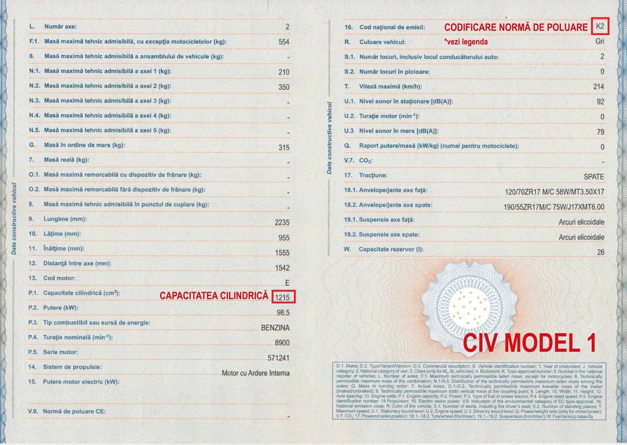 Modelul 2 de CIV – În acest document, capacitatea cilindrică este menționată la categoria P1, iar norma de poluare la punctul 17. Cod național de emisii.