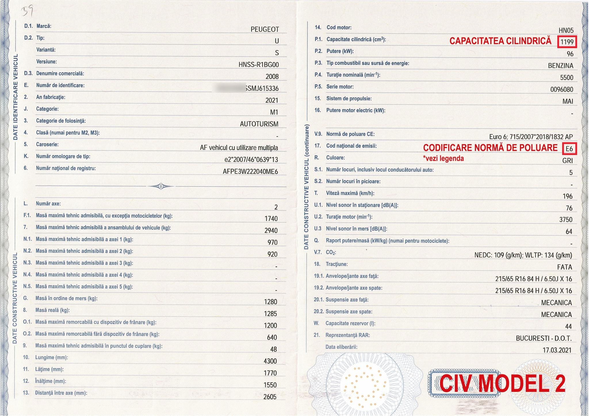 Modelul 3 de CIV – În acest document, capacitatea cilindrică este menționată la punctul 10, iar norma de poluare la punctul 5. Gradul de poluare este codificat prin ultimele două caractere ale numărului de omologare. Nu luați în calcul simbolul slash “/” și nici anul fabricației.