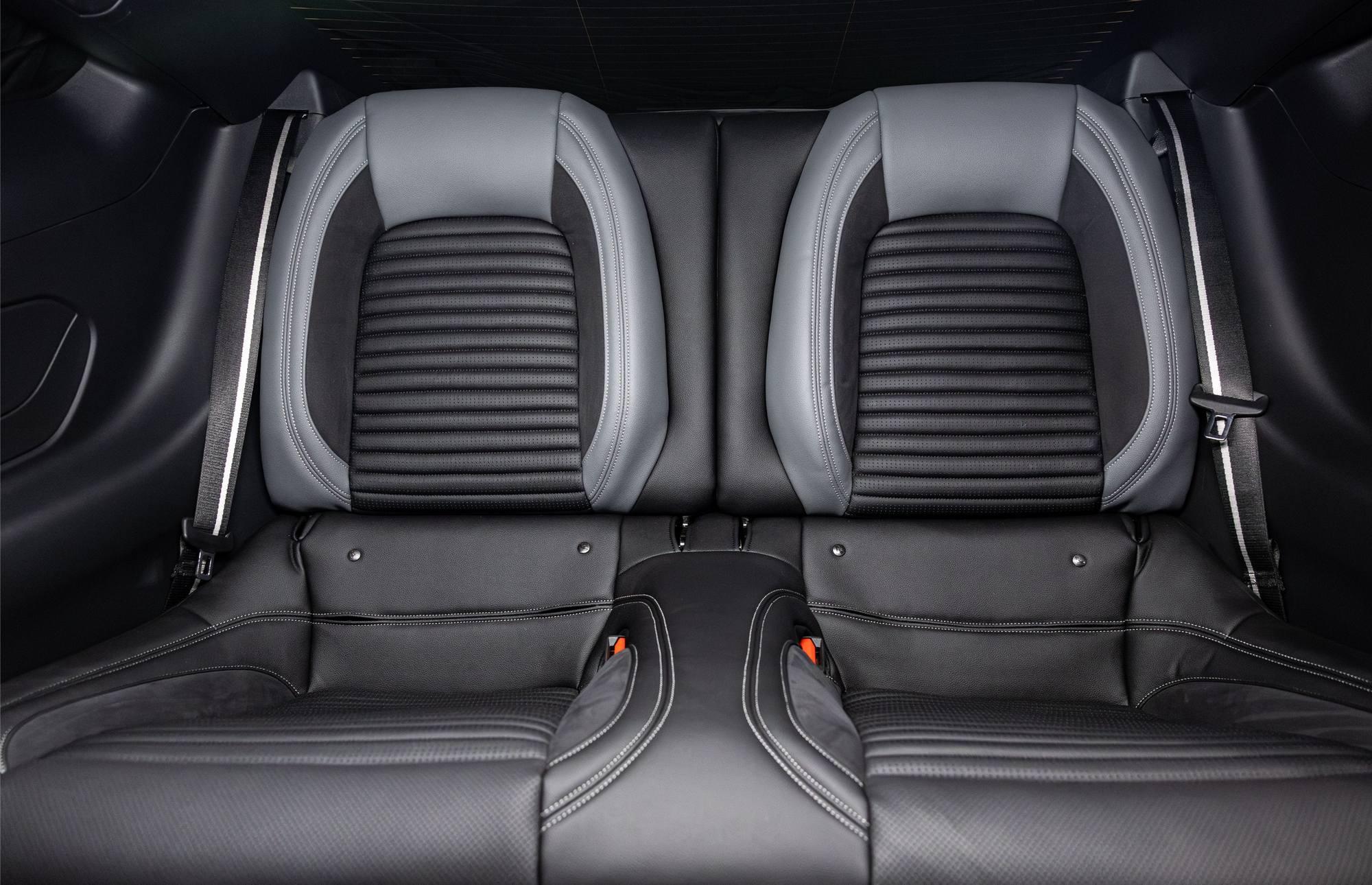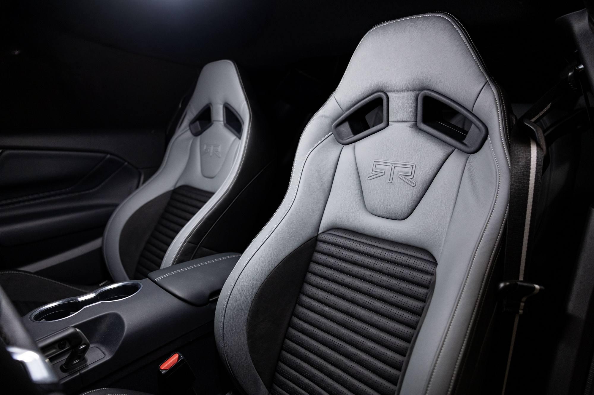 Interiorul păstrează funcționalitatea de bază a Mustang-ului GT, dar cu accente premium RTR: scaune sport Recaro tapisate în piele gri-negru cu detalii distinctive, inserturi, cusături speciale și logo RTR, plus plăcuță serializată cu semnătura fondatorului Vaughn Gittin Jr.