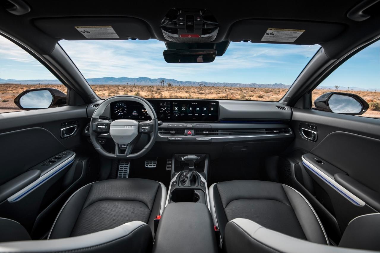 Habitaclul promite un salt tehnologic important. Bordul este dominat de o dală digitală de 29,7 inci. Aceasta este compusă din două ecrane de 12,3 inci, unul pentru instrumentarul de bord, celălalt, pentru sistemul multimedia, la care se adaugă încă un display, vertical, de 5,1 inci, pentru climatizare. Sistemul de infotainment este compatibil wireless cu Apple CarPlay și Android Auto, iar asistentul vocal cu inteligență artificială generativă poate răspunde la întrebări și controla funcții precum aerul condiționat sau instalația audio. În ciuda acestui avans tehnologic, Kia păstrează butoane fizice sub ecranul central și un levier clasic de viteze, spre deosebire de rivalele directe, care preferă comutatoarele minimaliste.