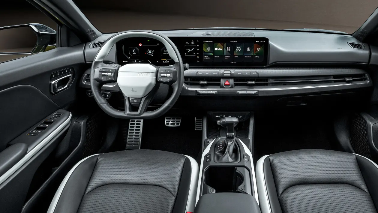 Habitaclul impresionează printr-un ansamblu de afișaje care însumează aproape 30 de inci. Instrumentarul digital de 12,3” este completat de un ecran de 5,3 inci, pentru climatizare, și de un display central tactil, tot de 12,3”, pentru centrul de infotainment. Toate versiunile oferă conexiuni Apple CarPlay și Android Auto, în timp ce versiunile superioare adaugă încărcare wireless pentru telefon, sistem audio Harman Kardon și scaune față încălzite și ventilate, îmbrăcate în piele artificială. Sistemul Digital Key permite folosirea smartphone-ului pe post de cheie, iar asistentul vocal răspunde la comanda „Hey, Kia!”.