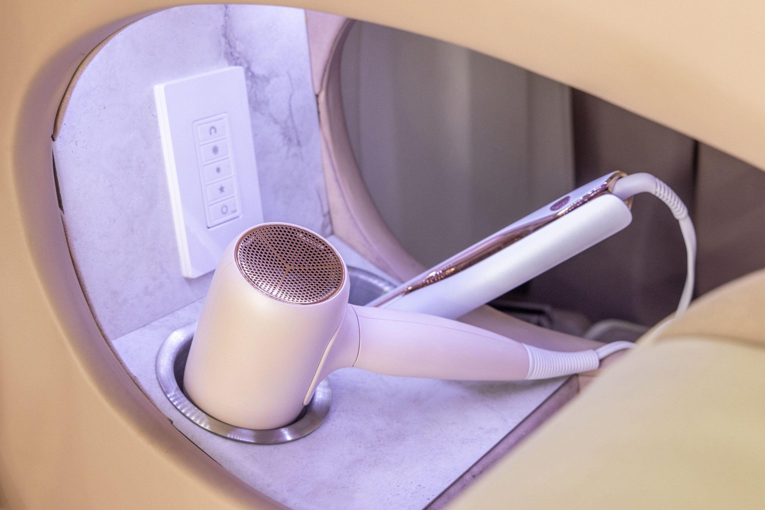 Apare, bineînțeles, și o stație de manichiură. În locurile din față, pasagerii se pot bucura de schimbări rapide de ojă la „barul de unghii” în mișcare cu iluminare UV/LED. Este ideal pentru momentele în care „mai sunt cinci minute până la plecare” chiar înseam­nă cinci minute.