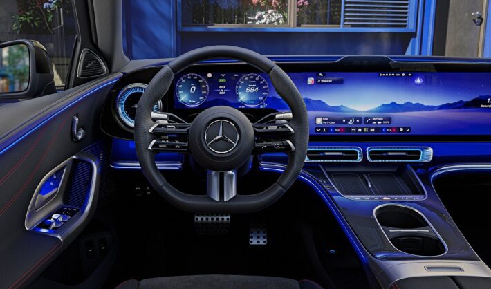 La nivel tehnologic, habitaclul integrează sistemele MBUX Hyperscreen și Superscreen, care creează un spațiu digital continuu pe întreaga planșă de bord. Iluminarea ambientală contribuie la o atmosferă personalizabilă, extinsă inclusiv la plafonul panoramic Sky Control. Sunt disponibile zece stiluri ambientale, cu iluminare și sunet sincronizate. Plafonul panoramic iluminat transformă interiorul într-un cer pe care se află 162 de stele.