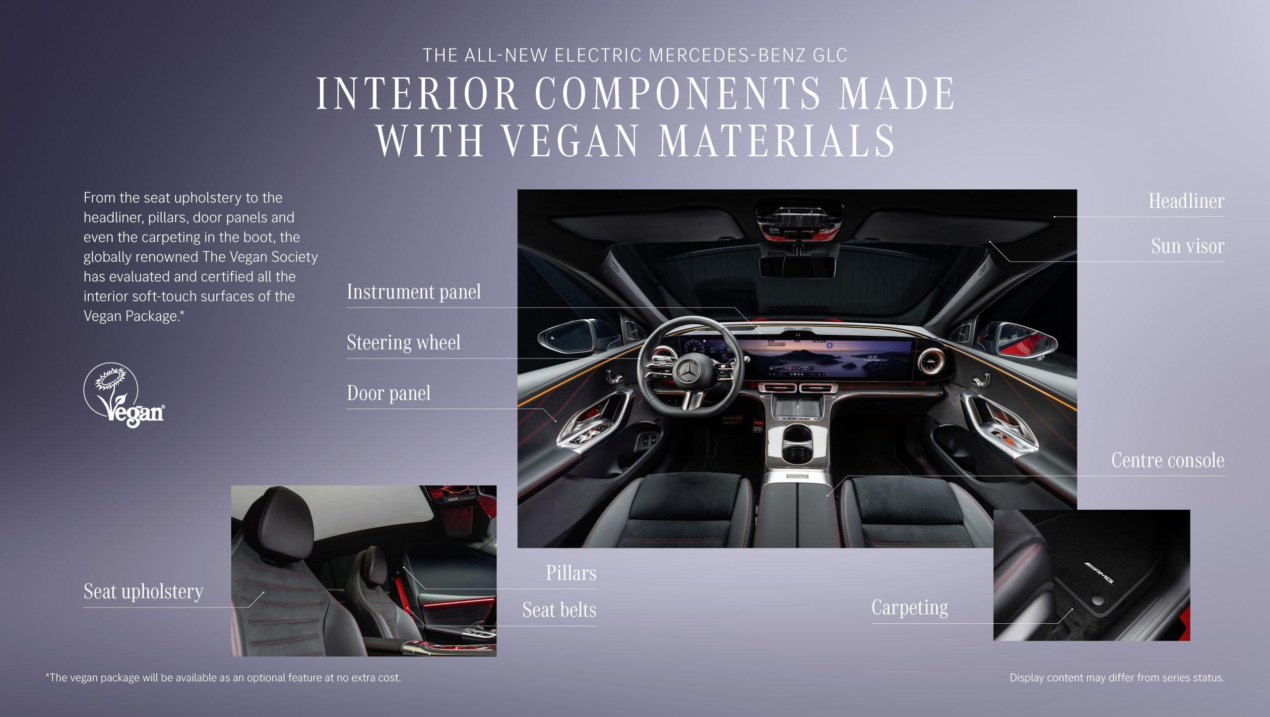 The Vegan Society a certificat, de asemenea, că în toate etapele de producție și procesare nu au fost adăugate sau utilizate sub nicio formă ingrediente sau aditivi de origine animală, fie procesați, fie neprocesați. Sistemul pentru produsele vegane a auditat un total de aproximativ 100 de componente de materiale de la diverși furnizori Mercedes-Benz, în conformitate cu standardele sale de certificare. Iar Pachetul Vegan certificat va fi introdus ca opțiune pentru interior odată cu noul GLC electric.
