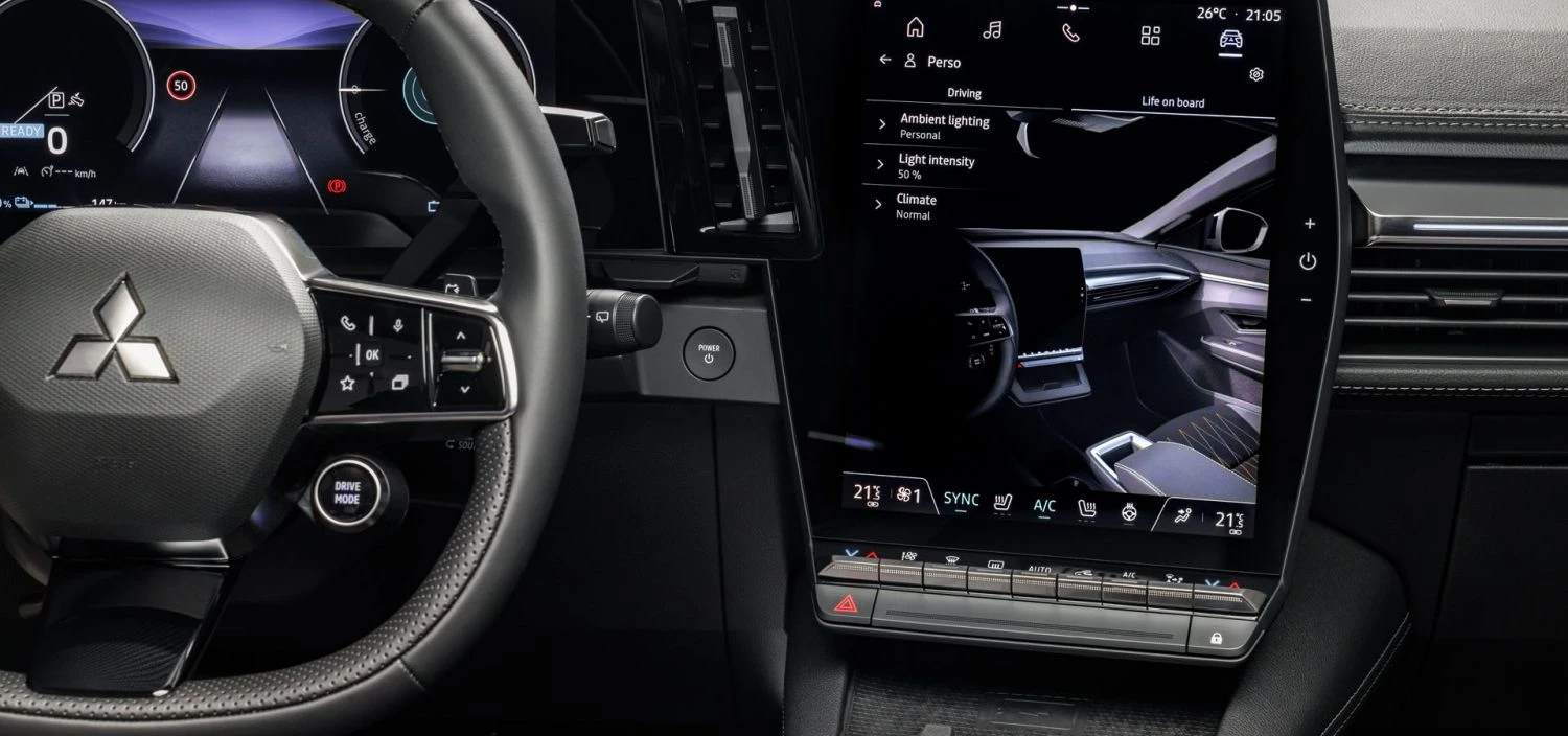 Habitaclul preia în mare măsură arhitectura Scénic-ului, însă cu sigla Mitsubishi pe volan. Consola centrală găzduiește un ecran tactil de 10,4 inci cu sistem Google integrat, iar în fața șoferului se află o instrumentație digitală de 12,3”. Comenzile fizice pentru climatizare și scurtăturile pentru dezactivarea anumitor sisteme de asistență sporesc ergonomia.