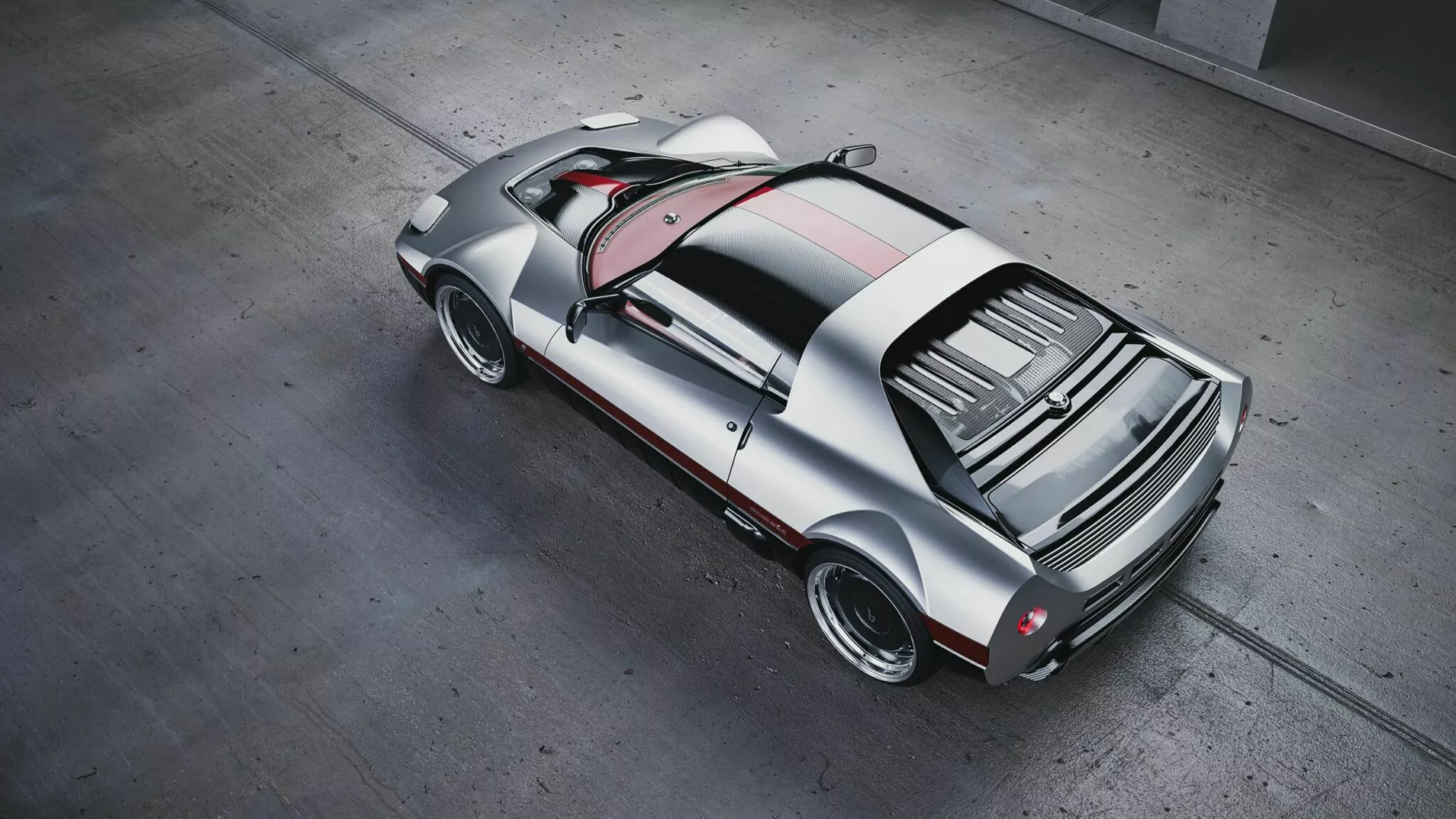 Partea din spate concentrează numeroase detalii într-un spațiu redus. Un arc de siguranță sculptat se îmbină cu un spate scurt, dotat cu stopuri rotunde și o capotă a motorului cu aer vintage. Anvelopele late sunt acoperite de aripi evazate ce le urmăresc fidel conturul, cu o formă conic-rotunjită în față, completate de un difuzor de aer din fibră de carbon în spate. Între stopuri se află patru fante decupate dreptunghiular, dintre care, cele două exterioare funcționează ca aerisiri pentru răcirea motorului, iar perechea centrală ascunde ieșirile sistemului de evacuare.