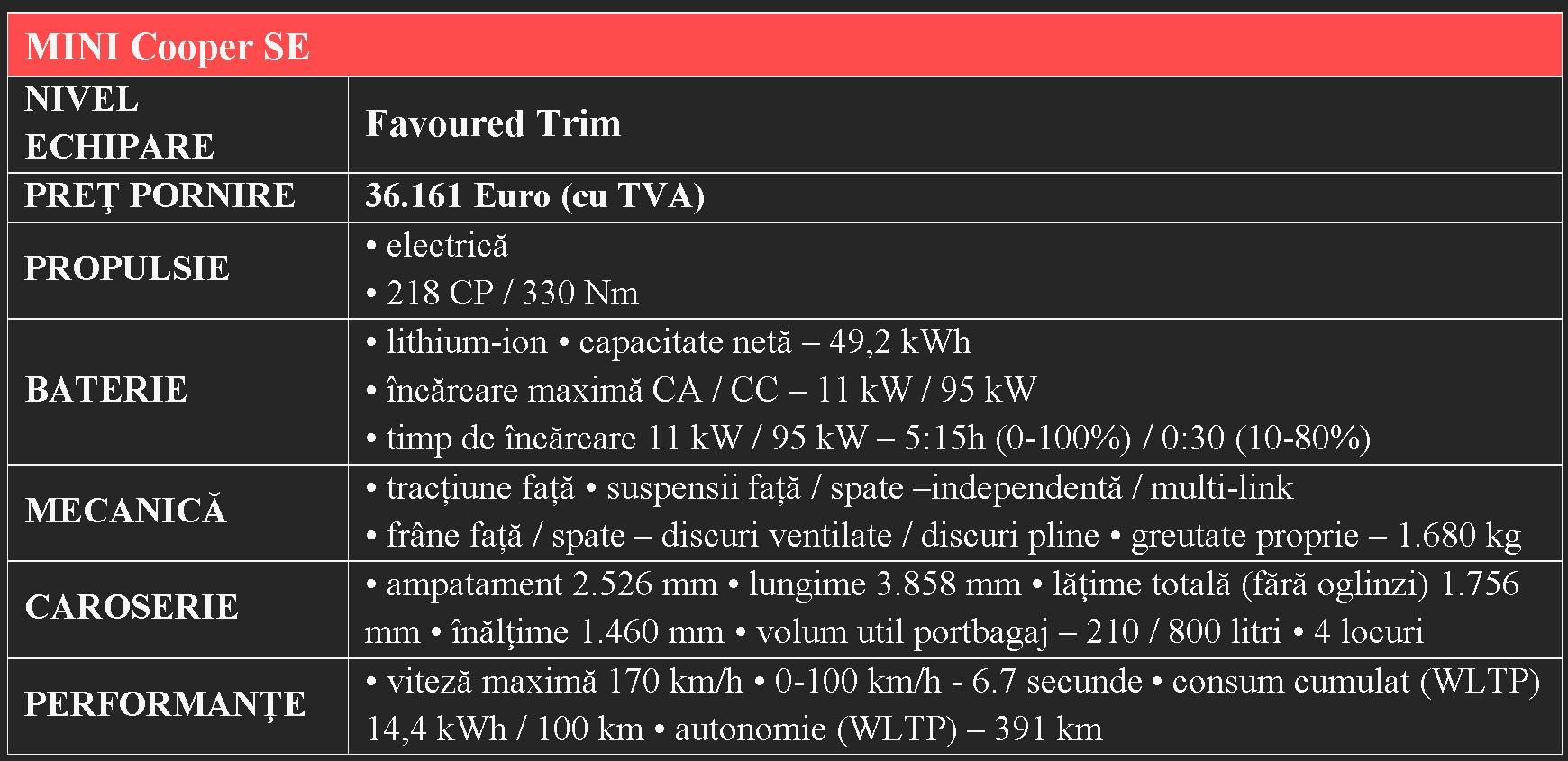 Este exact valoarea (ce-i drept maximă) pe care o s-o găsești la rubrica „Consum electric” pentru noul Mini Cooper SE pe site-ul importatorului.