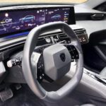 Ca și la E-Peugeot 3008 GT volanul este îmbrăcat în piele și are seturile de comenzi încastrate în ornamente lucioase de culoare neagră.  Dimensiunile mici și forma puternic aplatizată se conectează vizual la ecranul curbat Peugeot Panoramic i-Cockpit (opțional) care pare că levitează deasupra planșei de bord. Poți investiga gradul de atenție acordată detaliilor dacă te uiți în spatele și sub ecranul plutitor cu diagonala de 21″: vei descoperi că este grijuliu acoperită cu material textil.