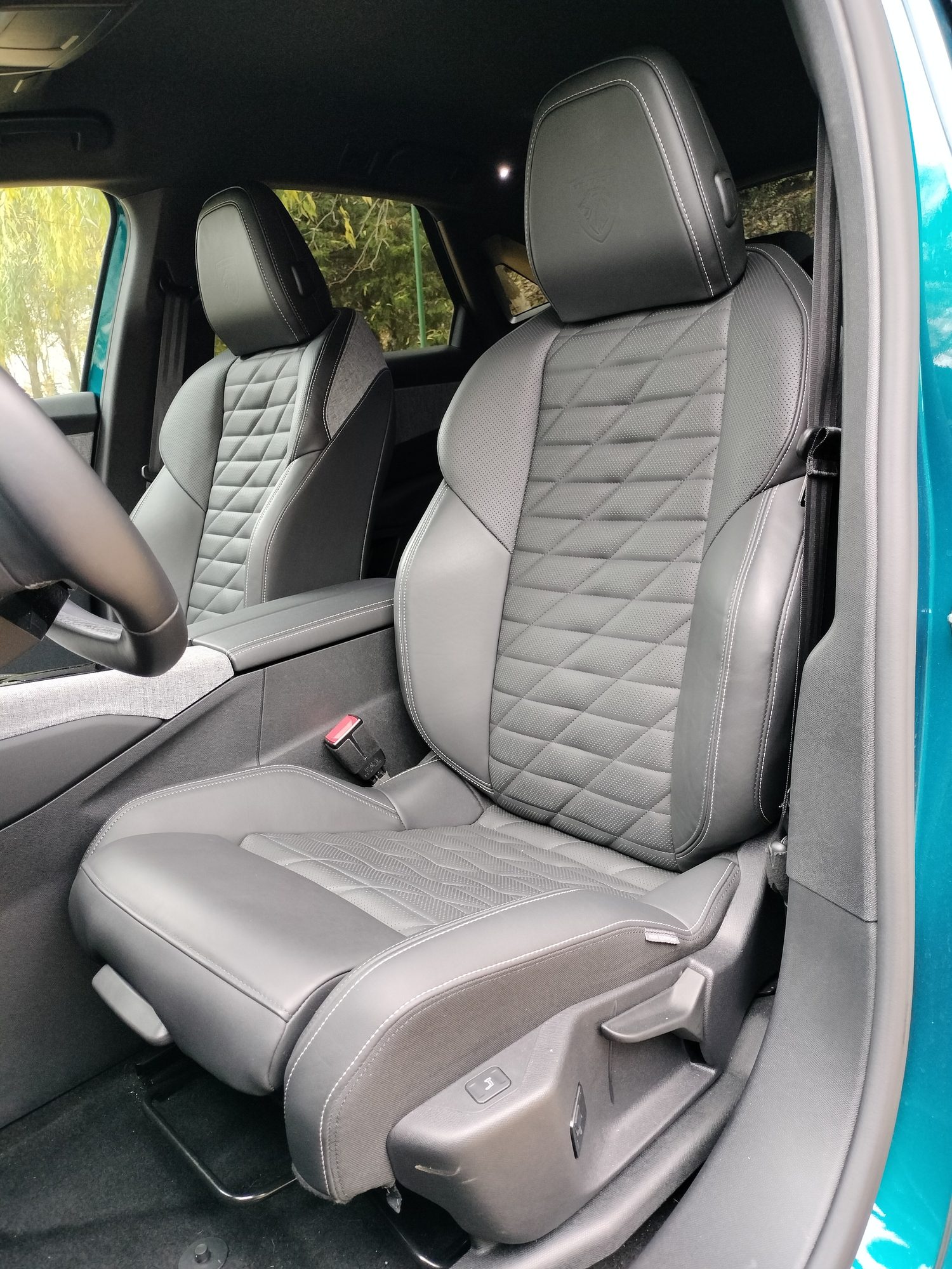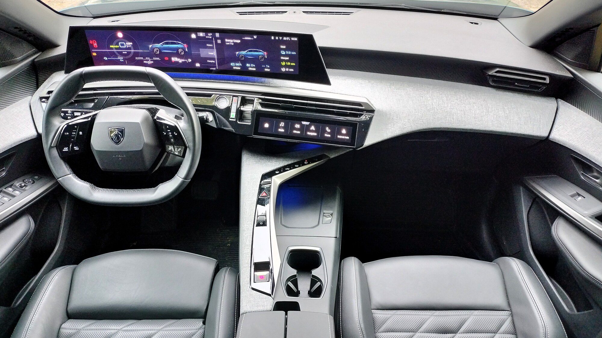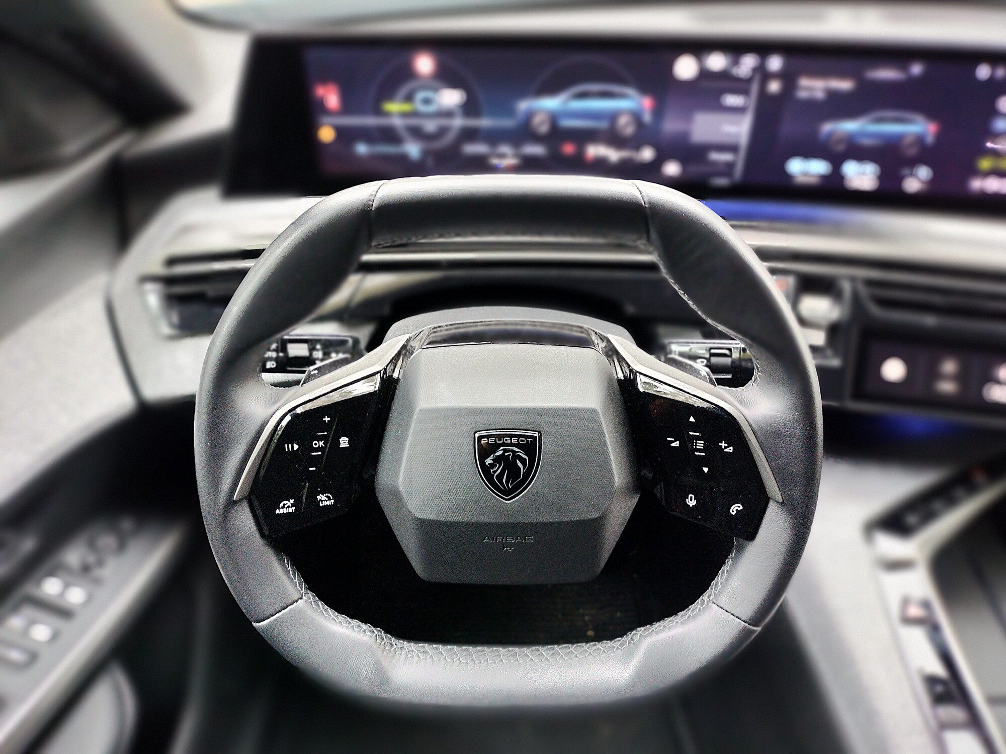 Ca și la E-Peugeot 3008 GT volanul este îmbrăcat în piele și are seturile de comenzi încastrate în ornamente lucioase de culoare neagră.  Dimensiunile mici și forma puternic aplatizată se conectează vizual la ecranul curbat Peugeot Panoramic i-Cockpit (opțional) care pare că levitează deasupra planșei de bord. Poți investiga gradul de atenție acordată detaliilor dacă te uiți în spatele și sub ecranul plutitor cu diagonala de 21″: vei descoperi că este grijuliu acoperită cu material textil.