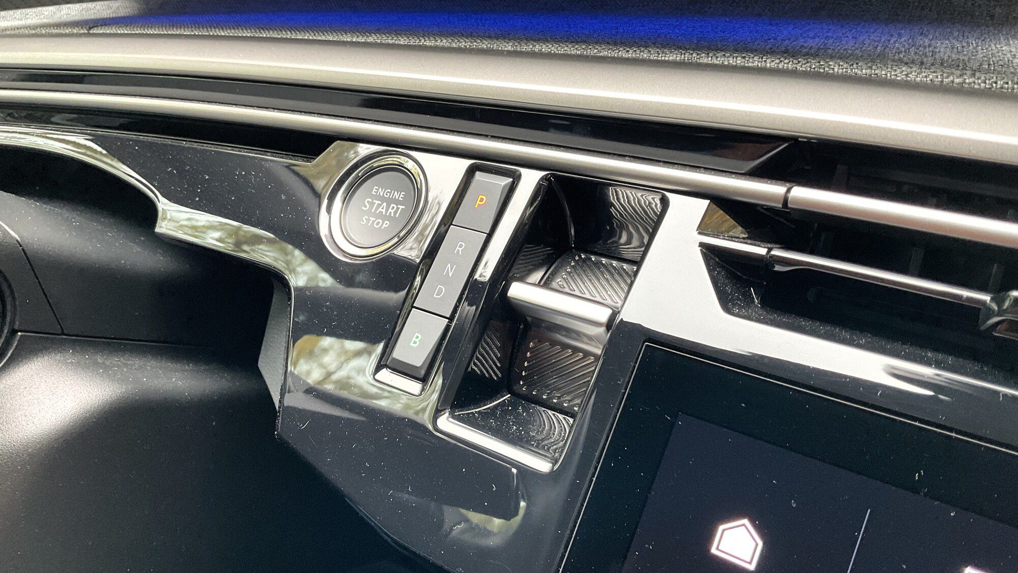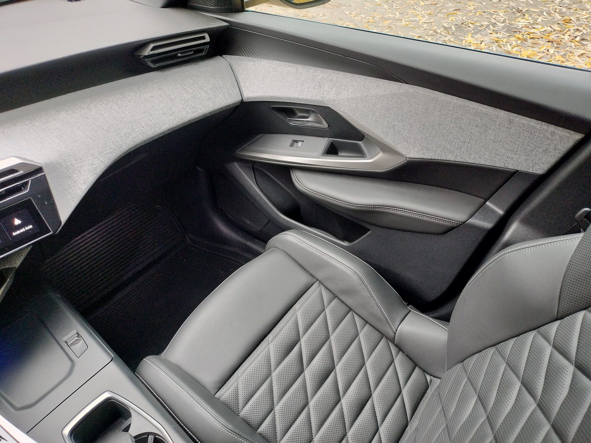 Este (aproape) exact aceeași atmosferă de care m-am bucurat și în E-Peugeot 3008 GT. La o prima vedere nu lipsește nimic din ceea ce ar putea fi considerat indispensabil. În schimb tot ceea ce era important este la locul lui. Materialul textil gri pepit este prezent în continuare pe planșa de bord, consola mediană și pe toate fețele de uși.