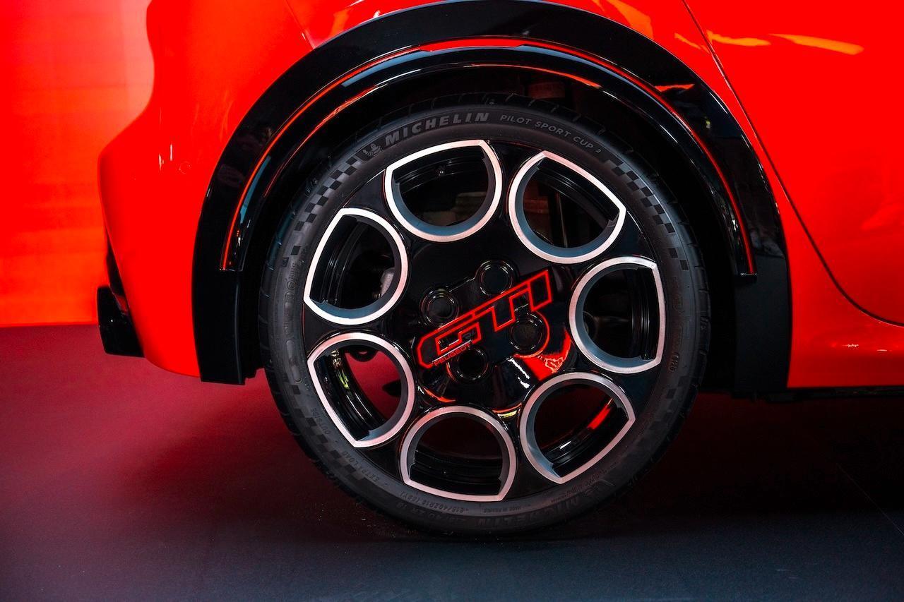 Pentru o estetică aparte și eficiență aerodinamică sporită, modelul integrează un spoiler frontal, un difuzor spate cu stop de ceață central și un eleron generos pe hayon. Detaliile roșii, o nuanță exclusivă GTi, accentuează agresivitatea modelului și apar pe grilă, logo, aripi, jante, etriere și chiar sub faruri.