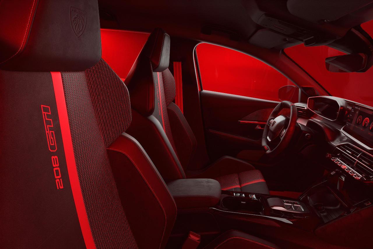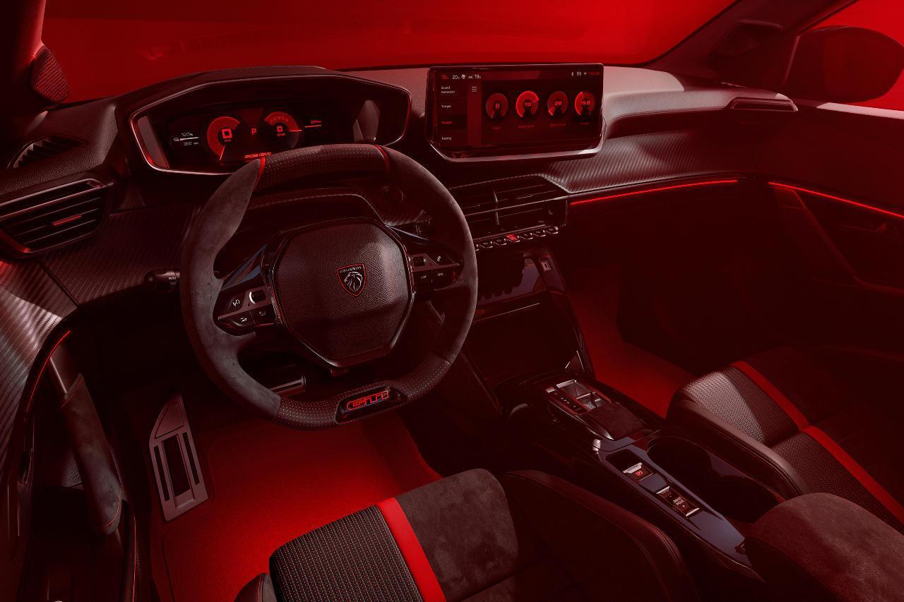 Atmosfera sportivă se regăsește și la interior. Roșul domină vizual: de la mochete și centuri, până la cusături și covorașe. Scaunele sport sunt inspirate direct din cele ale modelului 205 GTi, iar volanul compact, îmbrăcat în piele perforată și Alcantara, poartă emblema GTi. Planșa de bord combină piele, materiale textile de calitate, Alcantara și imitații de carbon, pentru un rezultat plăcut atât vizual, cât și tactil.