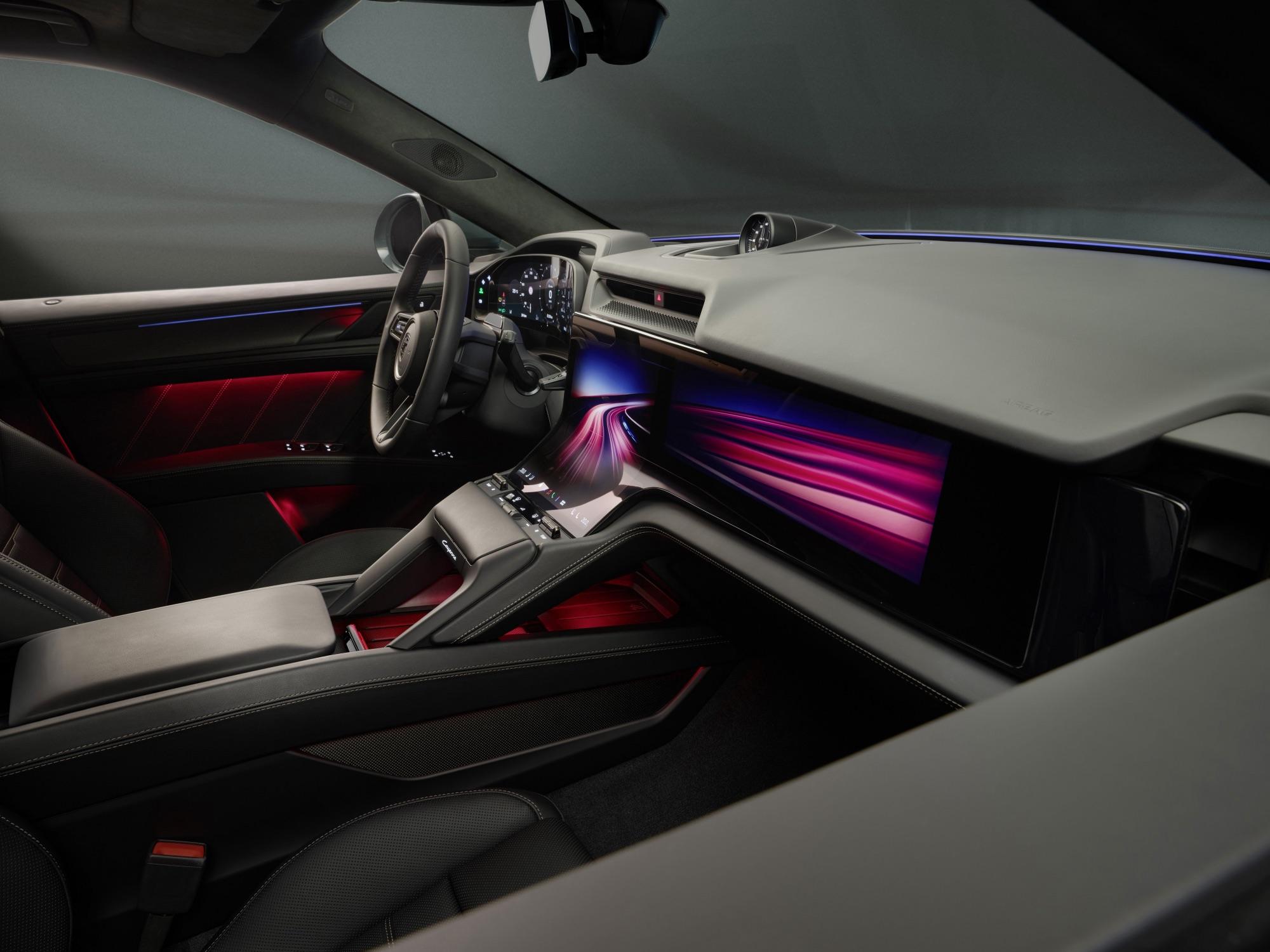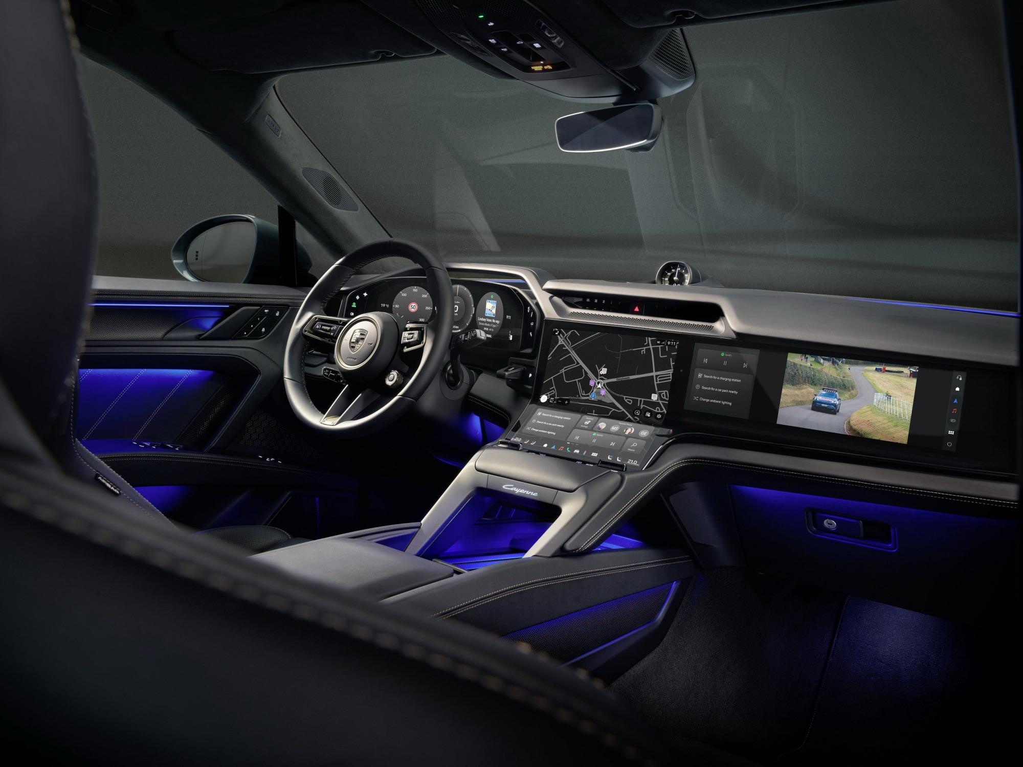 Noul Porsche Cayenne va folosi o planșă de bord digitală, în interior regăsindu-se nu mai puțin de trei ecrane, inclusiv noul display central OLED curbat numit Flow Display. Acesta are o diagonală de 14,25 cm și este curbat în partea de jos. Un al treilea ecran, opțional, de 14,9 inchi va fi amplasat în fața pasagerului față. În premieră, Cayenne electric va dispune și de un head-up display cu realitate augmentată.