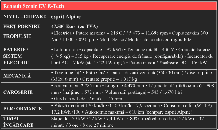 Noul Renault Scenic E-Tech este Tehnologizat (include sisteme multiple de siguranţă -30 mai exact!), Avangardist (Solarbay este cel mai la îndemână exemplu dar şi cele peste 2000 de sisteme de siguranţă brevetate de Renault din 1970 până astăzi), Responsabil (conţine în medie 37% material reciclat în toate componentele feroase şi până la 80% aluminiu reciclat în toate componentele care se deschid – portiere, capotă) şi Eficient (autonomia din test, obţinută în condiţii de rulare care nu au vizat obsesiv obţinerea celui mai bun consum posibil a fost una foarte reezonabilă – circa 420 km).
