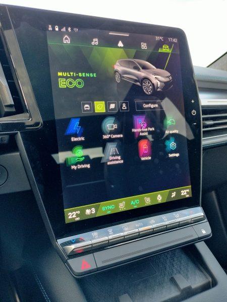 Revenit la comenzi descopăr layout-ul utilzat de Renault pentru amenajarea planşei de bord. Display-ul în formă de L, cu o suprafaţă totală de 874 cm2 ocupă lacom planşa de bord. Volanul cu trei spiţe este îmbrăcat într-un mix de piele Alcantara şi Nappa, are formă rectangulară şi cusături tricolore. Cum era de aşteptat, conţine şi butonul Multi-Sense.