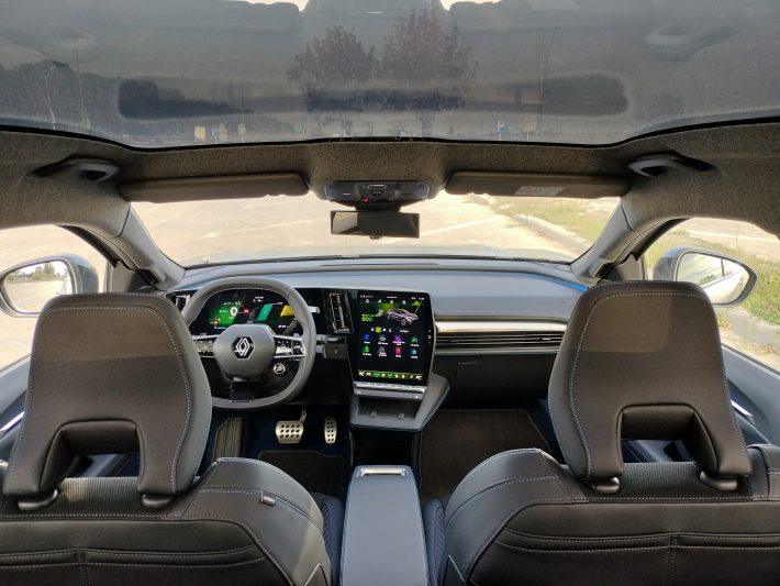 La acest capitol, noul Renault Scenic E-Tech este un maestru. Descoperi asta însă după ce te aşezi pe oricare din cele patru locuri foarte ospitaliere şi ridici ochii în sus. Într-o primă fază s-ar putea să te mire faptul că plafonul panoramic Solarbay, cu o lungime de 121 cm şi o lăţime de peste 85 cm, nu are copertină interioară. Eventual, ai putea sesiza că şi gradul de transparență este unul uşor lăptos. Realizezi totuși că nu este în niciun caz atât de întunecat încât să ţină piept luminii puternice de la soare pe timp de vară. Atunci?…