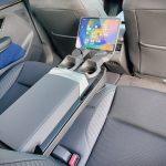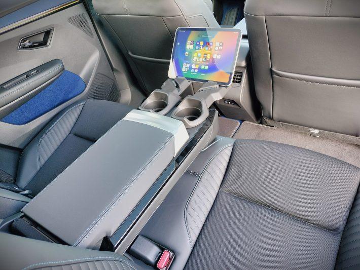 Nu are rost să comentez cât de bine se stă aici. Chiar dacă nu există nicio variantă de reglare pentru spătar, ergonomia este una foarte bună, asezonată cu un spaţiu îndestulător atât la cap cât şi la nivelul genunchilor. Cotiera centrală include, pe lângă suporturile de pahare pivotante, şi suporturi individuale pentru telefoane sau chiar pentru tabletă. Exact ca la Renault Rafale.
