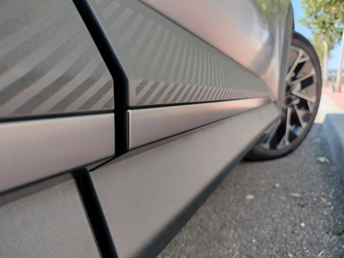 Cromatica gri-negru a caroseriei este atotprezentă, fiind conţinută de toate elementele etalate la exterior. Lămpi de stop, faruri, plafon, oglinzi retrovizoare exterioare, ornamentaţia perimetrală de la geamurile laterale, jante sau protecțiile din partea inferioară a uşilor – totul este omogen şi conferă imaginii generale o tentă apăsată de tehnologie high-tech.