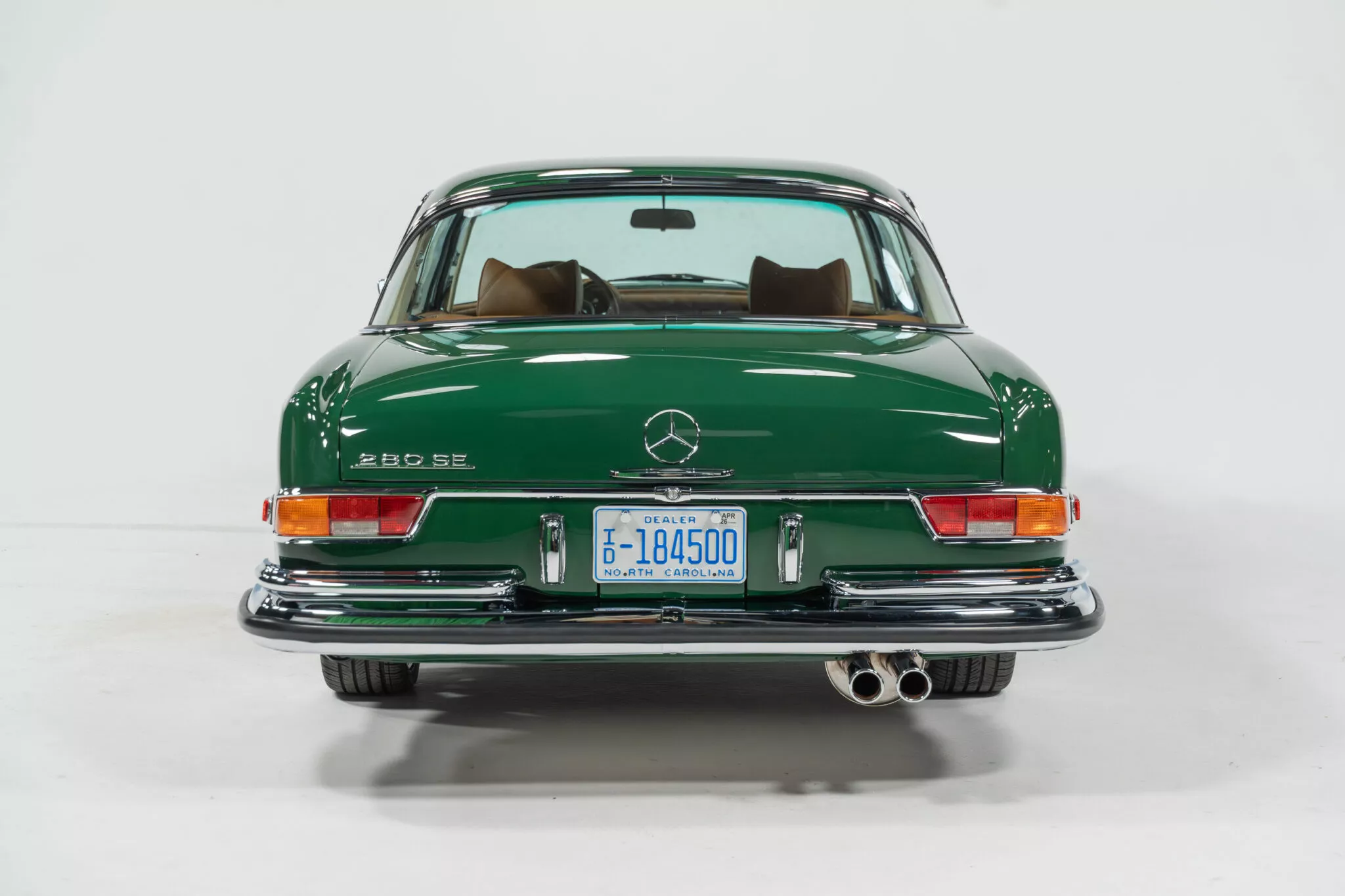 În mod surprinzător pentru un proiect atât de amplu, exteriorul modelului Mercedes-Benz 280SE a rămas aproape neschimbat. Caroseria păstrează liniile elegante ale coupe-ului din 1969, însă a fost refinisată într-o nuanță nouă de verde Axalta Chromax XP Irish Green. Automobilul rulează acum pe un set special de jante billet (frezate direct dintr-un bloc de aluminiu), proiectate cu capace de roată aparente flotante cu sigle fixe, care rămân orientate corect chiar și în mers. În rest, elementele clasice au fost păstrate cu grijă. Bare cromate față și spate, grila frontală de dimensiuni mari, oglinda laterală de pe partea șoferului și farurile originale au fost conservate, iar proiectul nu include iluminare modernă cu LED.