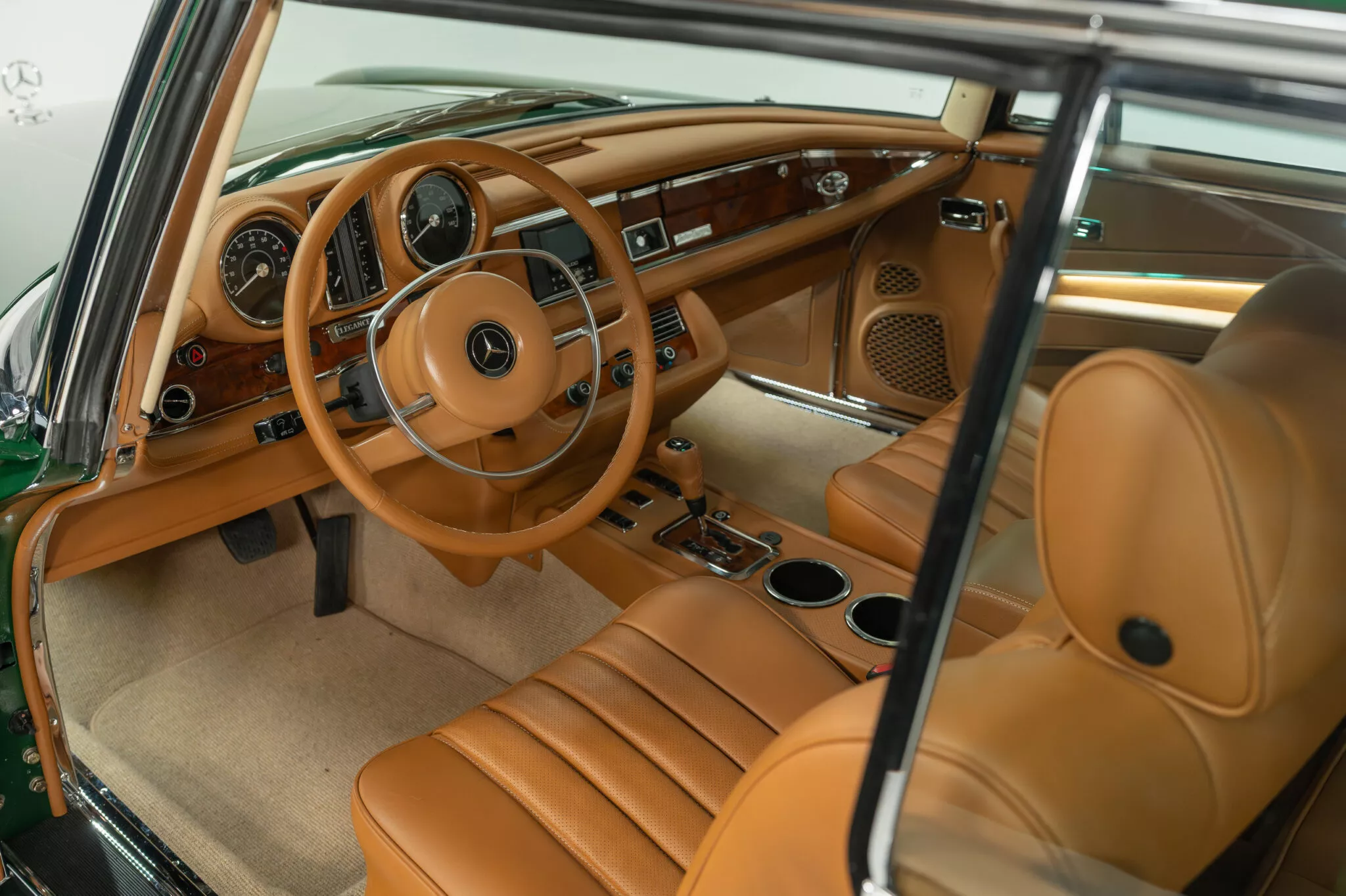 Habitaclul modelului Mercedes-Benz 280SE păstrează în mare parte configurația originală, însă a fost restaurat cu materiale de calitate superioară. Retro Designs a retapițat interiorul în piele maro nouă și a integrat un set de comenzi actualizate, completate de inserții din lemn revizuite.