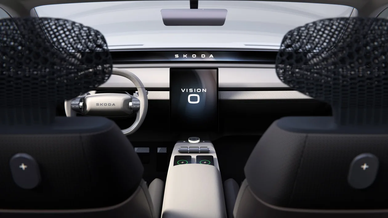 Un element distinctiv îl reprezintă tetierele realizate prin imprimare 3D, cu o structură aerisită pentru șofer și pasageri. Acestea contribuie nu doar la confort, ci și la atmosfera modernă și inovatoare a interiorului. Uniformitatea materialelor utilizate în cabină garantează coerență vizuală, iar modul inteligent în care spațiul este folosit accentuează ușurința în utilizare. Intuitivitatea comenzilor simplifică experiența de condus, transformând interiorul într-un punct de referință pentru viitoarele modele Skoda.