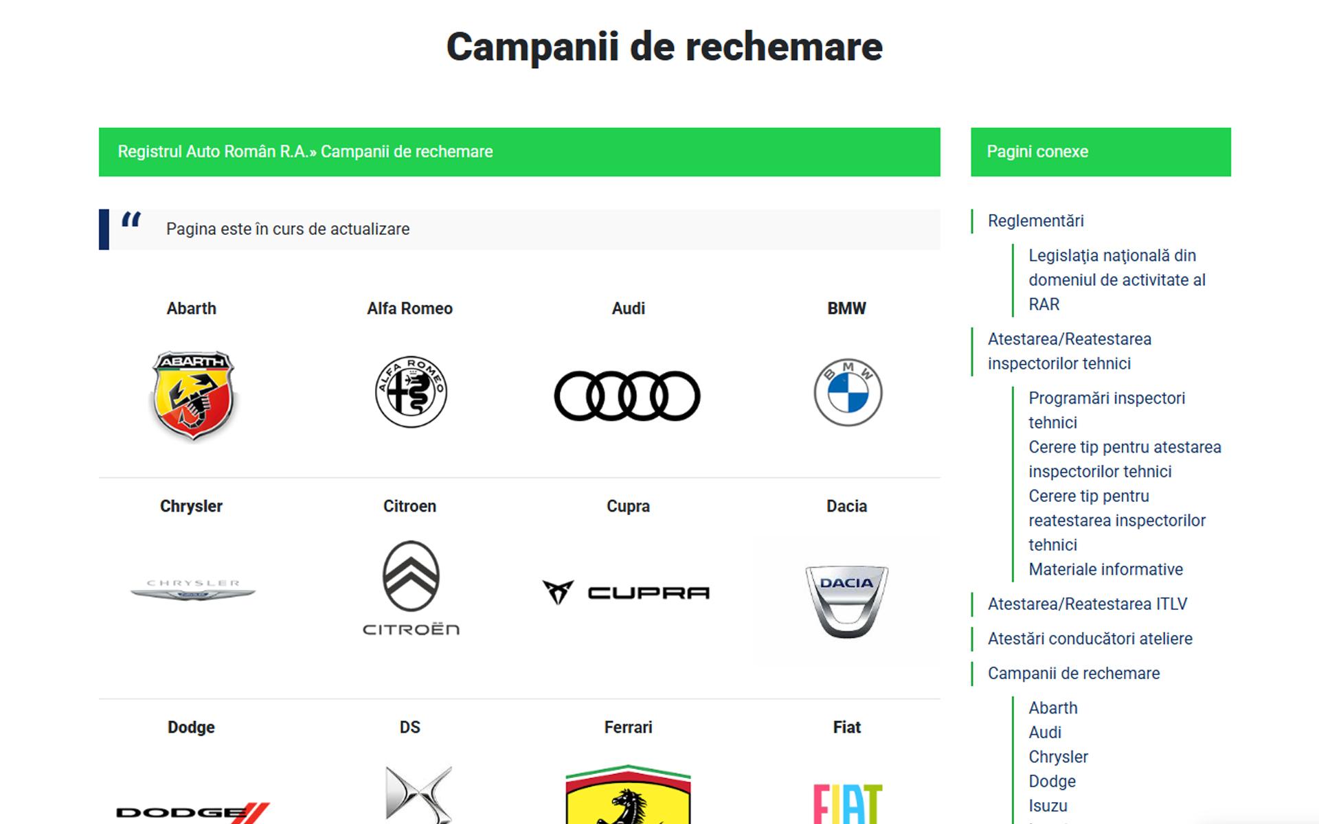 Pe site-ul RAR am creat secțiunea „Campanii de rechemare” pentru a veni în sprijinul utilizatorilor de vehicule cu o soluție pentru verificarea existenței campaniilor de rechemare pentru respectivele mărci sau modele.