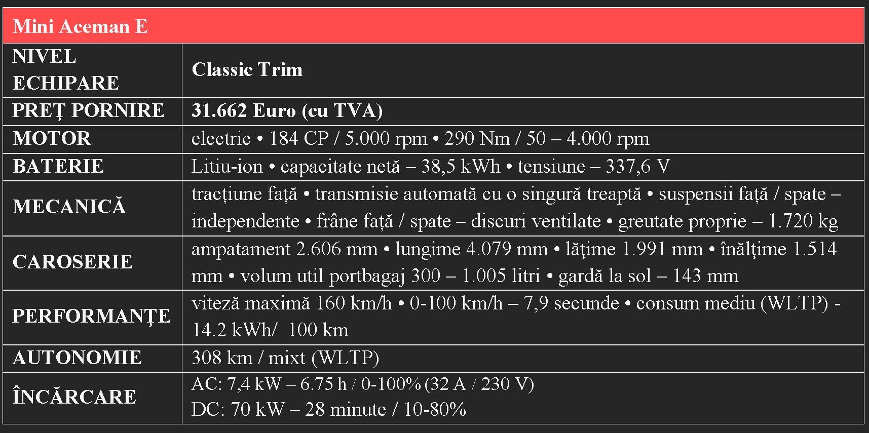 Bateria litiu-ion cu capacitatea netă de 38,5 kWh, plasată sub podea, are dublu. Pe de o parte asigură o autonomie care poate ajunge la peste 300 km şi pe de altă parte coboară centrul de greutate. Astfel, în pofida înălţimii de peste 1,5 metri, Mini Aceman abordează cu încredere virajele. Suspensia independentă la ambele punţi colaborează admirabil la acest efort, ruliul fiind unul relativ reţinut care parcă mai mult îndeamnă decât înăbuşă un stil de condus sportiv.