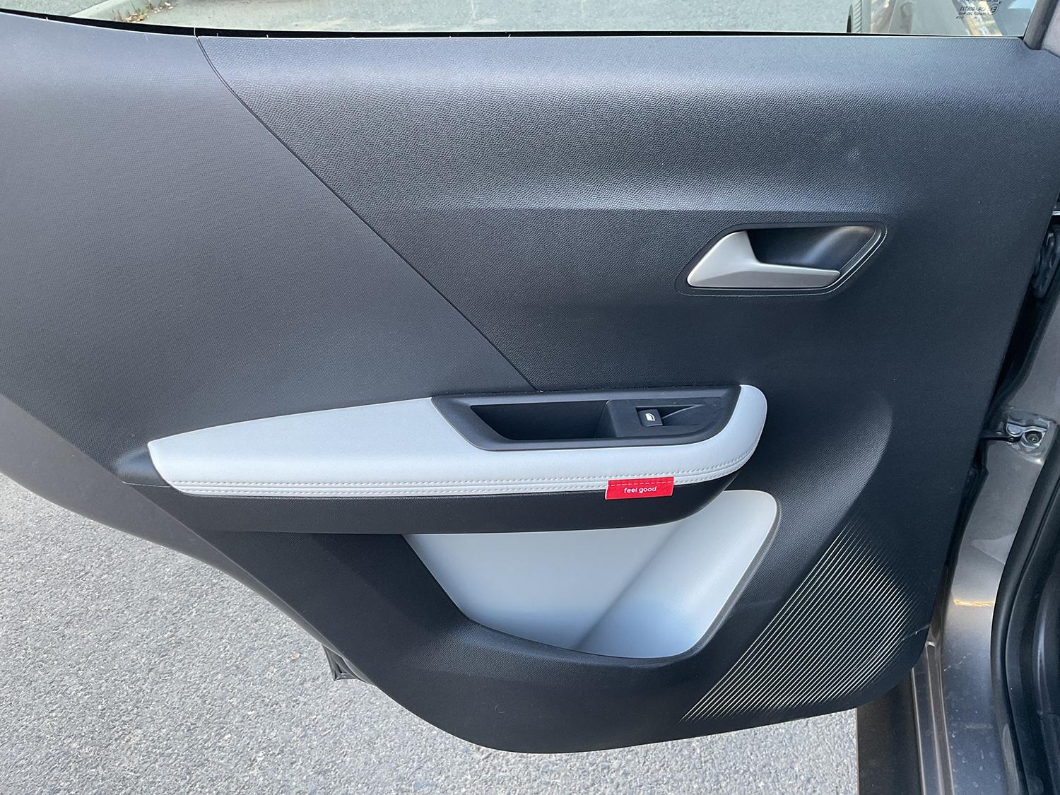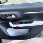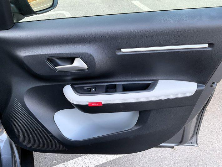 Fețele interioare ale uşilor sunt tratate econom fără a abandona stilul șic. Sesizez o acumulare puternică de material plastic salvată de cromatica elegantă alb-negru. Negrul este tonul dominant din moment ce este expus de materialul plastic. Acesta este strategic străpuns de albul strălucitor folosit atât pentru inserţia de piele ecologică care îmbracă complet partea de sus a mânerelor dar şi ca fundal la spaţiile de depozitare amenajate în portiere. Se obţine astfel un contrast maxim şi un efect stilistic tonifiant.