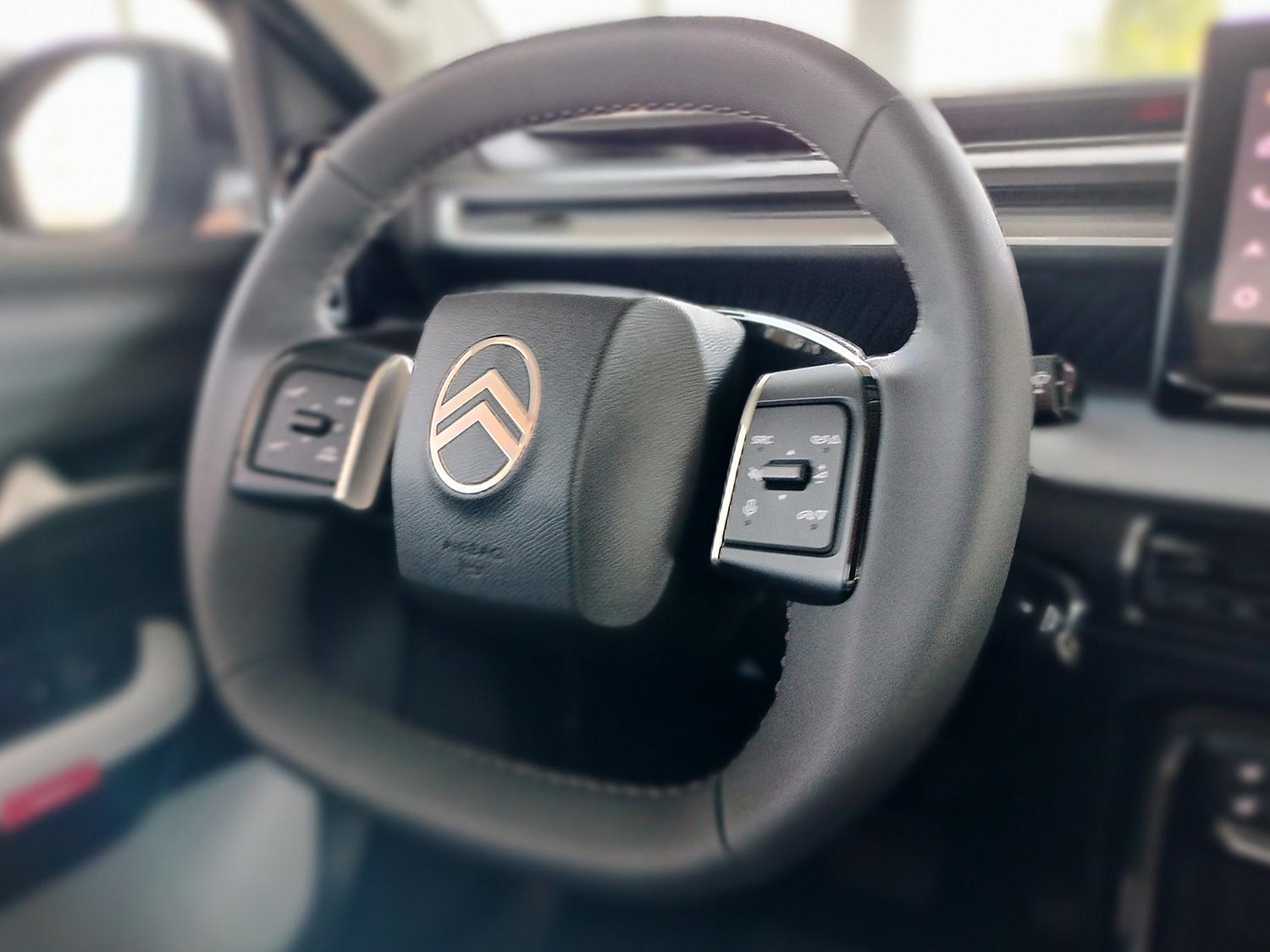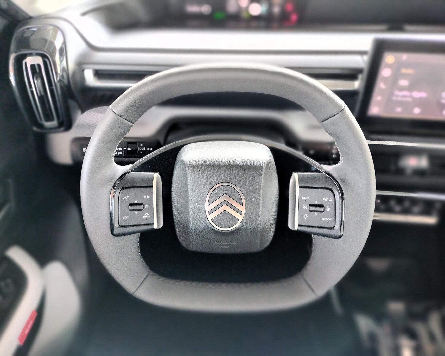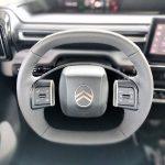 Designul curat, cu o singură spiţă orizontală, pune în evidenţă noua sigla Citroen plasată central şi ţinută captivă într-un contur oval.