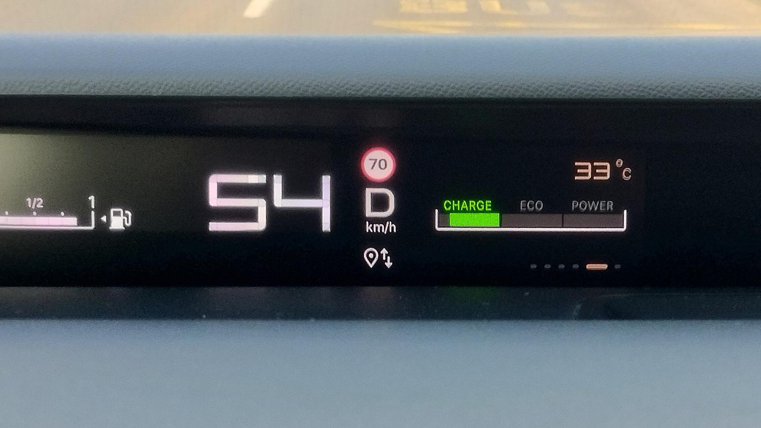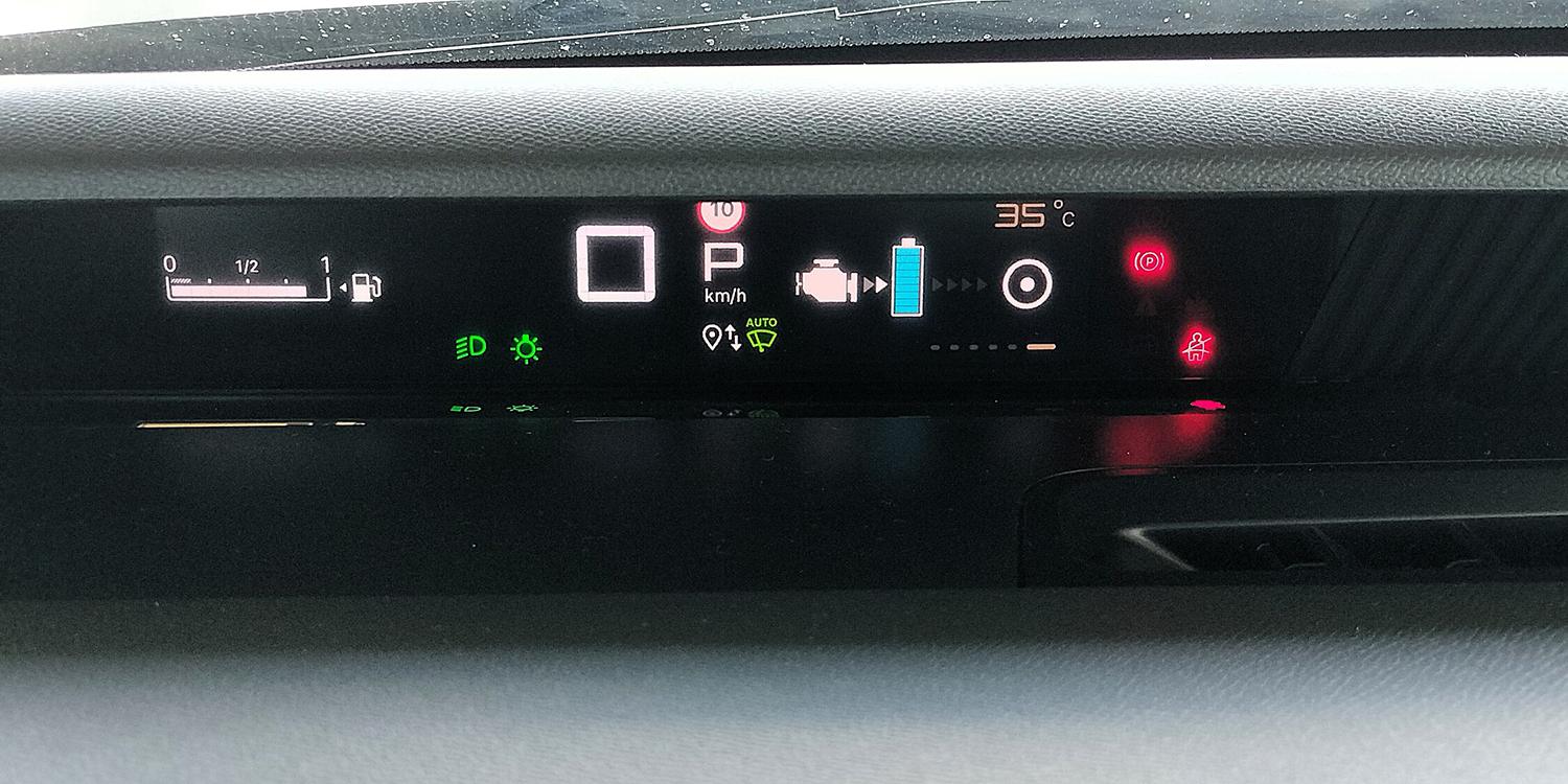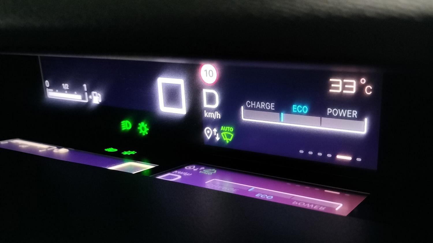 Informaţiile afişate sunt uşor lizibile şi acoperă întreg spectrul de care am nevoie ca să monitorizez călătoria sau parametrii tehnici vitali. Remarc absența turometrului. Dar dispariţia acestuia este legitimă pentru că nu-şi mai avea rostul în cadrul unui sistem de propulsie hibrid care se autogestionează nativ.