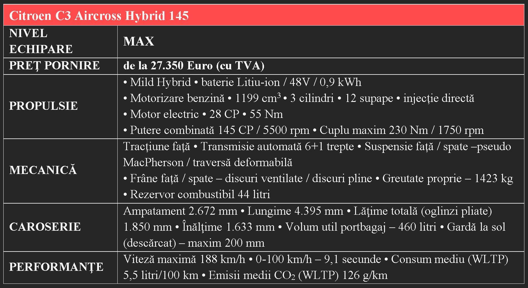 Cu un design proaspăt, un spaţiu interior deosebit de generos şi înarmat cu pachete de tehnologii care susţin economia de combustibil, siguranţa, confortul şi buna dispoziţie în timpul călătoriei, noul Citroen C3 Aircross MAX Hybrid 145 este o prezenţă convingătoare în segmentul SUV-urilor compacte.  Gaj stau multiplele sale aptitudini iar partea bună este că dacă te interesează doar una dintre ele, restul vin la pachet. Ceea ce nu este deloc puţin.