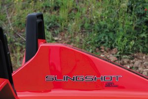 Scaunele din „spumă” sunt comode și se reglează manual, exact ca oglinzile. Și volanul este reglabil în plan vertical. În consola centrală din bordul minimalist se remarcă display-ul pe care sunt afișate informațiile referitoare la postul de radio ales și imaginile de la camera de marșarier. Materialele folosite în interior sunt rezistente la apă, motiv pentru care atunci când duci Slingshotul la spălătorie este de ajuns o singură trecere, atât pentru interior cât și pentru exterior! În fața pasagerului există un mic spațiu de depozitare, suficient pentru geanta unei șoferițe și mai mult decât suficient pentru portmoneul și telefonul unui „pilot”. În timpul călătoriei bagajele pot fi așezate în cutiile din spatele celor două scaune, acolo unde, odată ajunși la destinație, puteți încuia căștile obligatorii și pentru șofer și pentru pasager.