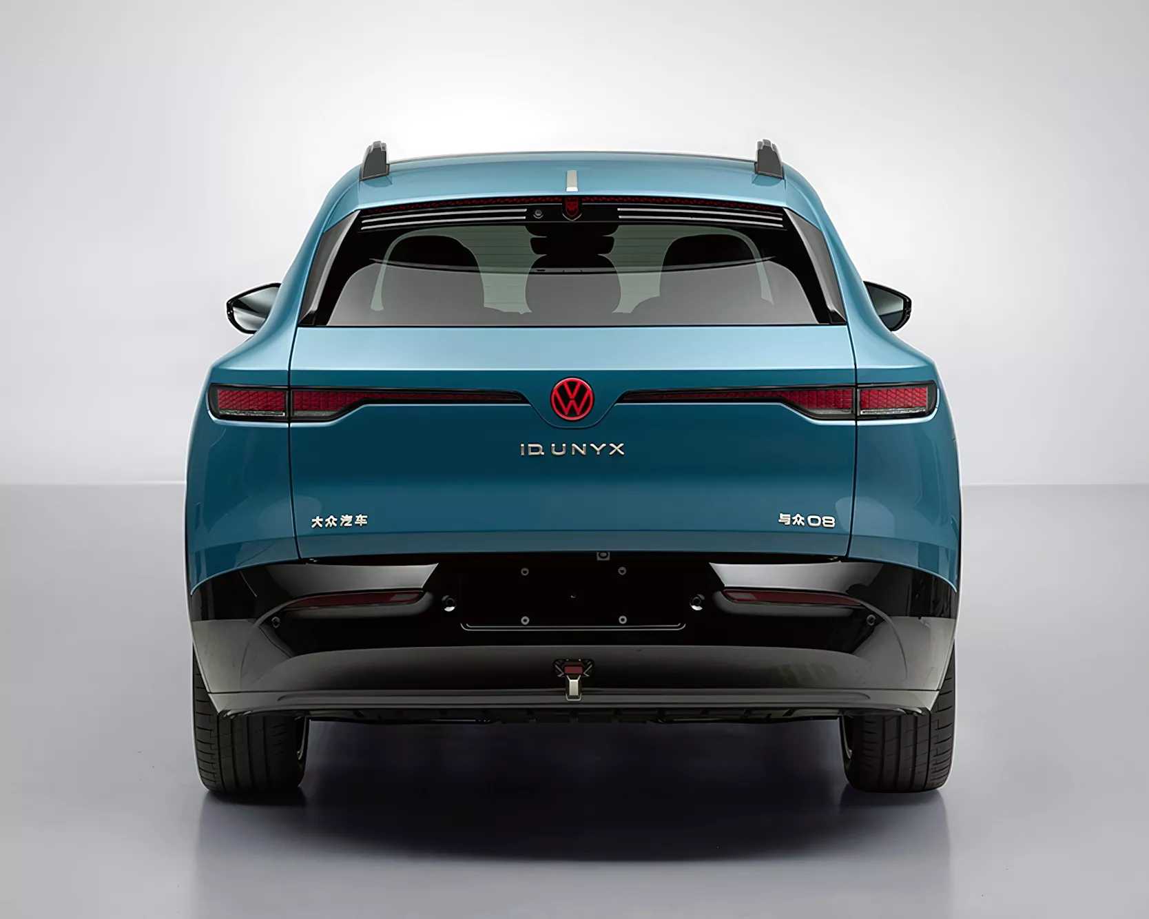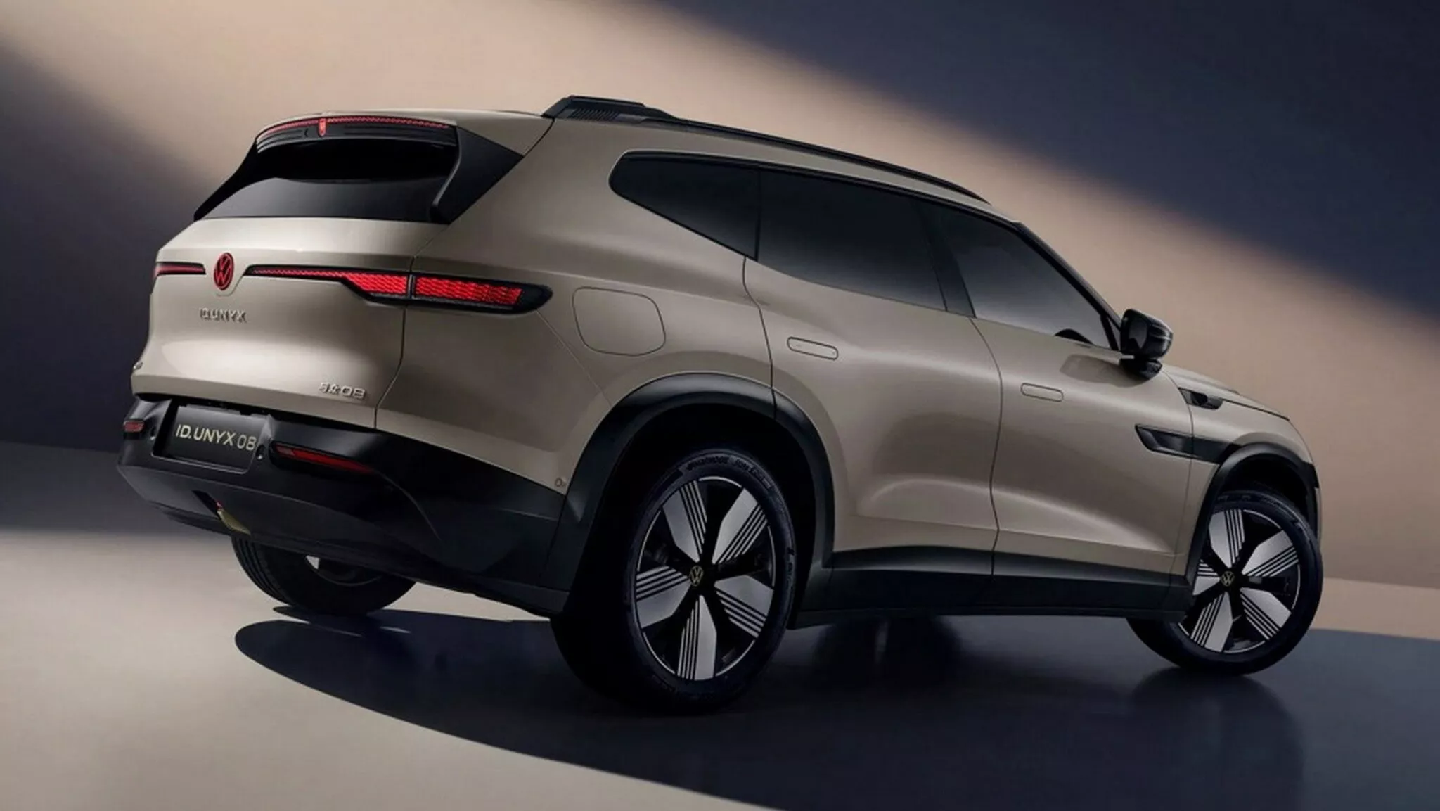 Designul exterior al lui VW ID. UNYX 08 rămâne fidel conceptului ID. EVO de anul trecut: linii sculptate, portiere fără rame, montanţi A negri, care creează efectul de „acoperiş plutitor”. Un detaliu rar îl reprezintă emblema iluminată, ce segmentează simetric blocurile optice din spate: un gest vizual menit să creeze identitate pentru sub-brandul UNYX. De asemenea, finisajele roţilor şi etrierelor evidenţiază opţiuni de personalizare: roţi cu cinci spiţe şi finisaj diamantat cu accente cupru și frâne Brembo. Din punct de vedere al proporţiilor, SUV-ul măsoară fix 5.000 mm lungime, 1.954 mm lăţime şi 1.688 mm înălţime, cu ampatament de 3.030 mm, valori ce îl plasează în categoria autoturismelor de clasă mare pe piaţa chineză.